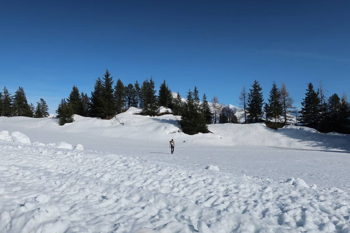 Vom Ausstieg entweder weiter hinauf zum Klettergarten und dort über irgendeine Kletterroute auf die Hochflächen neben dem Gschößwandhaus. Alternativ beim Ausstieg links durch einen Spalt und dann steil zurück zum Einstieg absteigen.