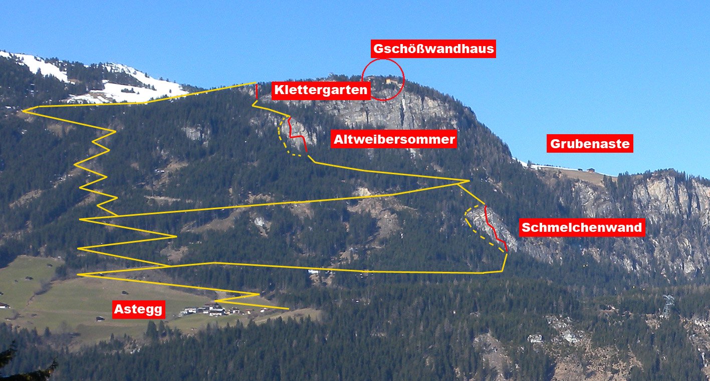 Gut mit dem "Altweibersommer" und dem Ausstieg im Klettergarten Gschößwand zu kombinieren - so kommt ein langer (12 Seillängen) Klettertag heraus. Diese Kombination wird von den Einheimischen "Umweg zum Gschöß" genannt.