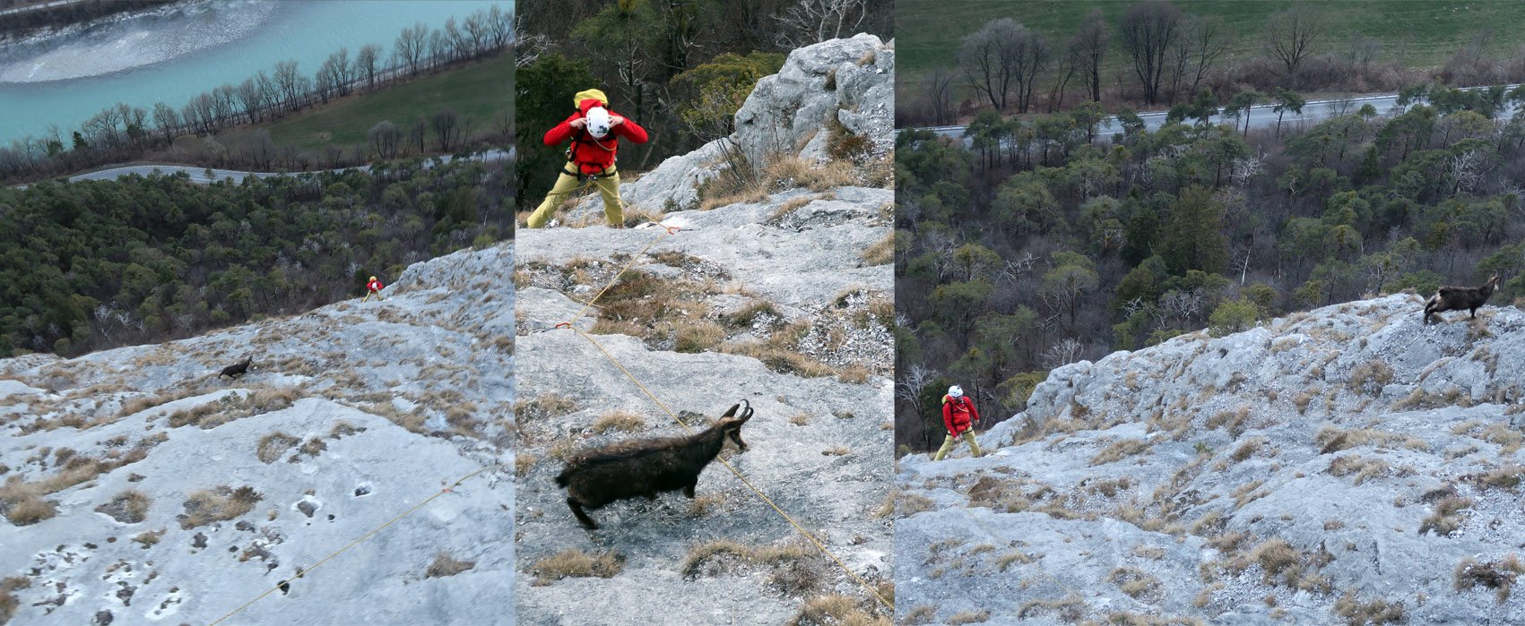 Vom Ende der Tour bei einem Haken quert man nach rechts zu einem Fixseil. Auf dem Fixseil hinauf (wenn es feucht ist, sehr heikel) und auf Bändern (Stellen 1, anfangs grüne, dann rote Markierung) bis zum Fußabstieg der Martinswand queren. Auf diesem zurück zum Parkplatz.