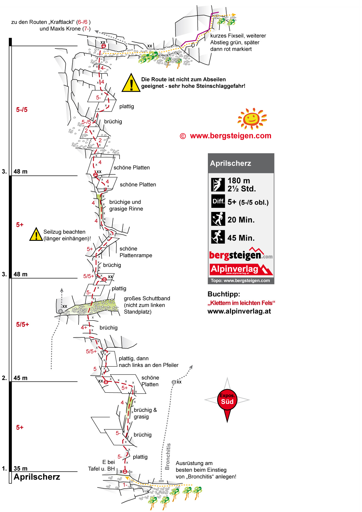 Die Route war anfangs tlw. brüchig und grasig („Magnesium brauchst keines, wenn du schwitzt, kannst du in die Erde greifen“). Das mit dem Bruch, dem Gras und der Erde ist mit der zunehmenden Zahl der Begeher deutlich besser geworden! Die Route gehört zu den leichteren Vorbaurouten.