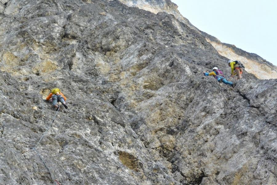 Für Dolomitenverhältnisse gut mit Bohrhaken abgesichert - in den leichten Seillängen aber durchaus weitere Abstände.
