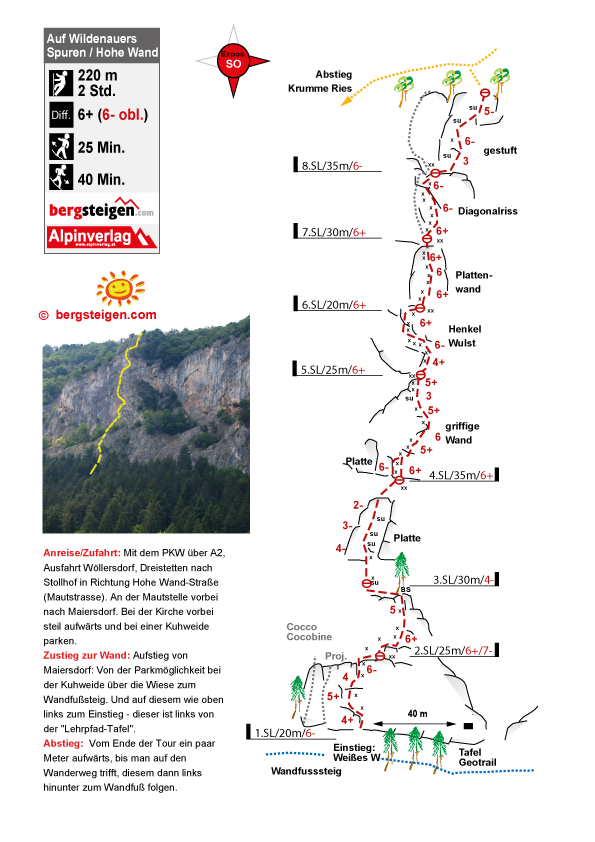 Alternativer Aufstieg von Maiersdorf: Von der Parkmöglichkeit bei der Kuhweide re. von der Kirche (Auffart bei der T Kreuzung) über die Wiese bis zu Zaun mit Überstieg bei einer Forststraße. Die Straße wenige Meter nach links und auf Steig eine weitere Forstraße überquerend zum Wandfusssteig und diesem nach links vorbei an gr. Brandluch und Klettergarten zum Einsteig folgen.