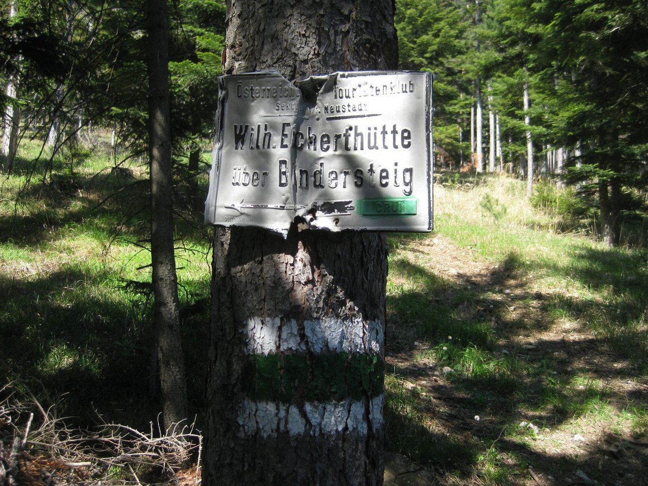 Über den markierten Grafenbergweg zurück zur Binderbank und zum Seiser Toni. Alternativ 10 min weiter hinauf Richtung Eicherthütte und über das Zahme Pechersteiglein (1-, blau markiert, Tafel) zum Wandfuß absteigen. Wegen der steilen Erdpassagen nur bei Trockenheit zu empfehlen! Unten führt der Weg durch ein lustiges Felsloch (1-), dieses ist außen umgehbar.