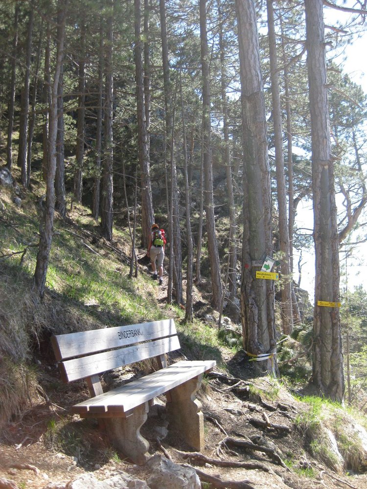 Von der Binderbank 20m nach rechts zum markanten Felsgrat. Mit Hilfe eines kurzen Drahtseiles über die erste Steilstufe hinweg (A/B), dann zwischen kleinen Föhren dem festen, sehr schönen Felsgrat folgen (eine kurze Stelle 1+, sonst 1-). Ein Ausweichen nach links in den Wald ist fast überall möglich. Weiter über Schrofen zu einem steilen Turm („Breiter Stein“ oder „Grafenberg“, Wandbuch). Diesen Turm links umgehen (1-) und in Kürze zur steinernen Grafenbergbank, wo man wieder auf den Grafenbergweg trifft. Von hier kann man mit wenigen Schritten auf die Spitze des Turmes gelangen (1-, lohnende Aussicht).