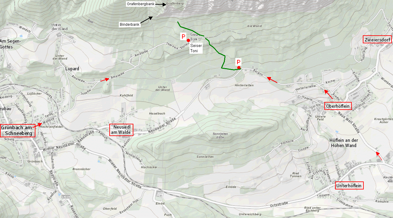 Von Grünbach am Schneeberg zur Pension Seiser Toni (Abzweigung bei der Kirche), 200 m VOR dem Saiser Toni auf einem Parkplatz parken. Alternativ kann man am nördlichsten Punkt der Straße zwischen Oberhöflein und Neusiedl am Walde bei der Abzweigung einer Forststraße parken (ca. 600m Seehöhe) und zu Fuß in 15 min zum Seiser Toni gehen. Dabei ist Ortskenntnis von Vorteil.