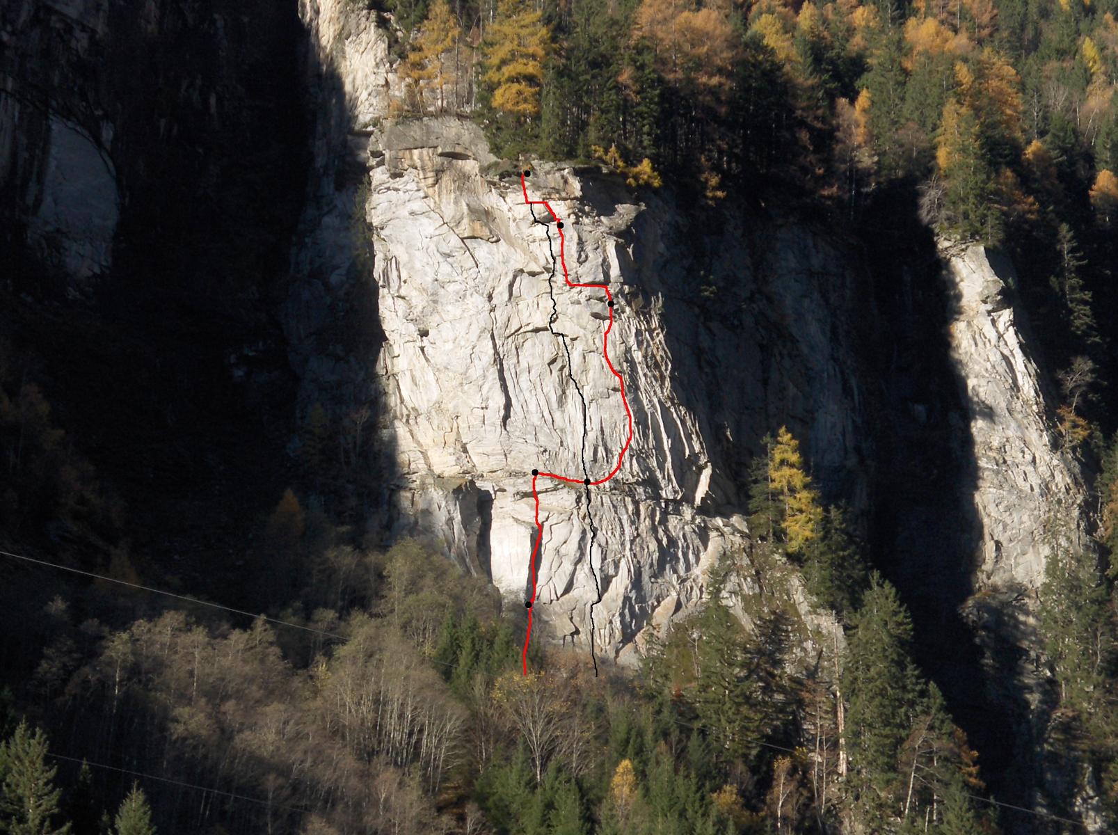 Seillänge und einen Rivet in der 2. Seillänge nichts. Es herrscht hauptsächlich diffizile Nagelei vor, wobei ohne Pecker gar nichts geht. Ab der 3. Seillänge ist die Tour sehr steil (siehe auch die Bemerkungen zum Abseilen über die Tour).