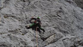 1. SL: Erst steil gerade hinauf (6-, BH schlecht erkennbar), über kleinen Überhang (6+) und leicht linkshaltend über leichteres Gelände (3) zum Fuß einer Plattenwand in Falllinie einer größeren Latsche. Zwischenstand an zwei BH möglich (ca. 25 m). Dann über einen Riss durch die Platten immer schwieriger bis zur Latsche (6), rechts vorbei und zum Stand an 2 BH auf kleinem Absatz. (50 m, 10 ZH, 6+)
