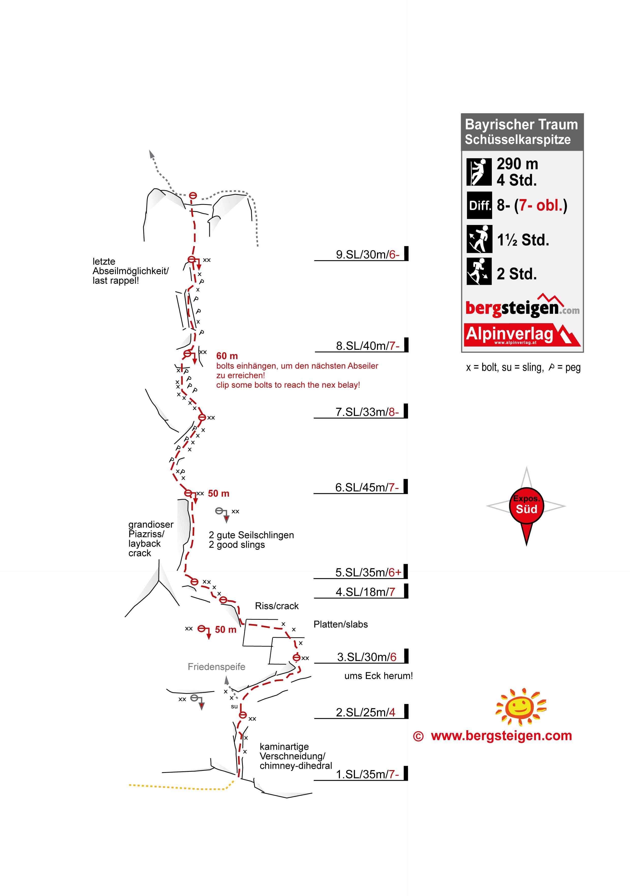 Man kann am Ende des Bayrischen Traums auch abseilen, aber das ist nicht trivial und es gab schon mehrere Bergungen, weil die Abseilstände nicht gefunden wurden. Unbedingt beim Abseilen Expressen einhängen!!