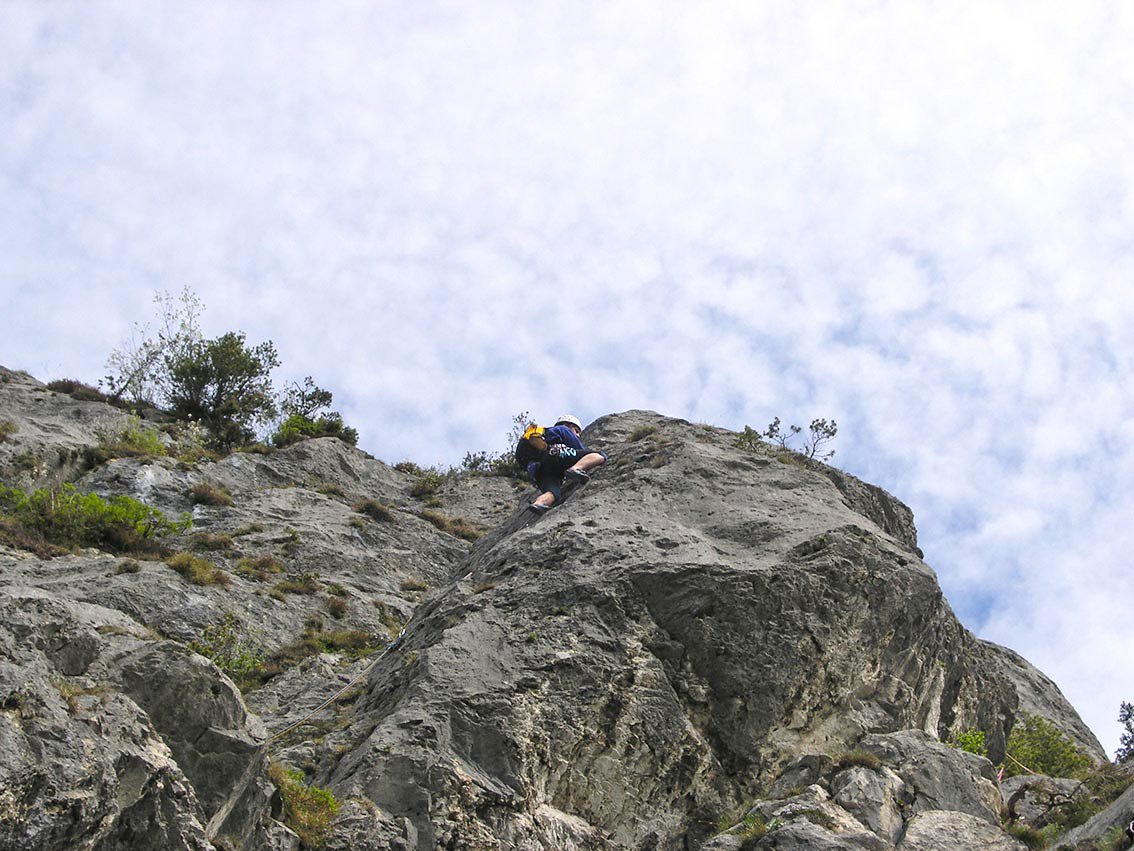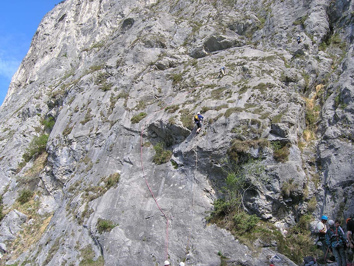 Die Routen sind ziemlich abgeklettert, deshalb ist die Bewertung auch etwas härter. Oft ist in diesem Sektor recht viel los. Rechts der beiden Touren befinden sich noch zwei leichte Pfeilerrouten, an denen man sich die Zeit vertreiben kann, wenn man anstehen muss. Den Helm sollte man auf dem Kopf haben - oben laufen viele Gämsen herum die Steine lostreten können und bei starkem Föhn fallen die Steine ohne Zutun die Wand hinunter.
