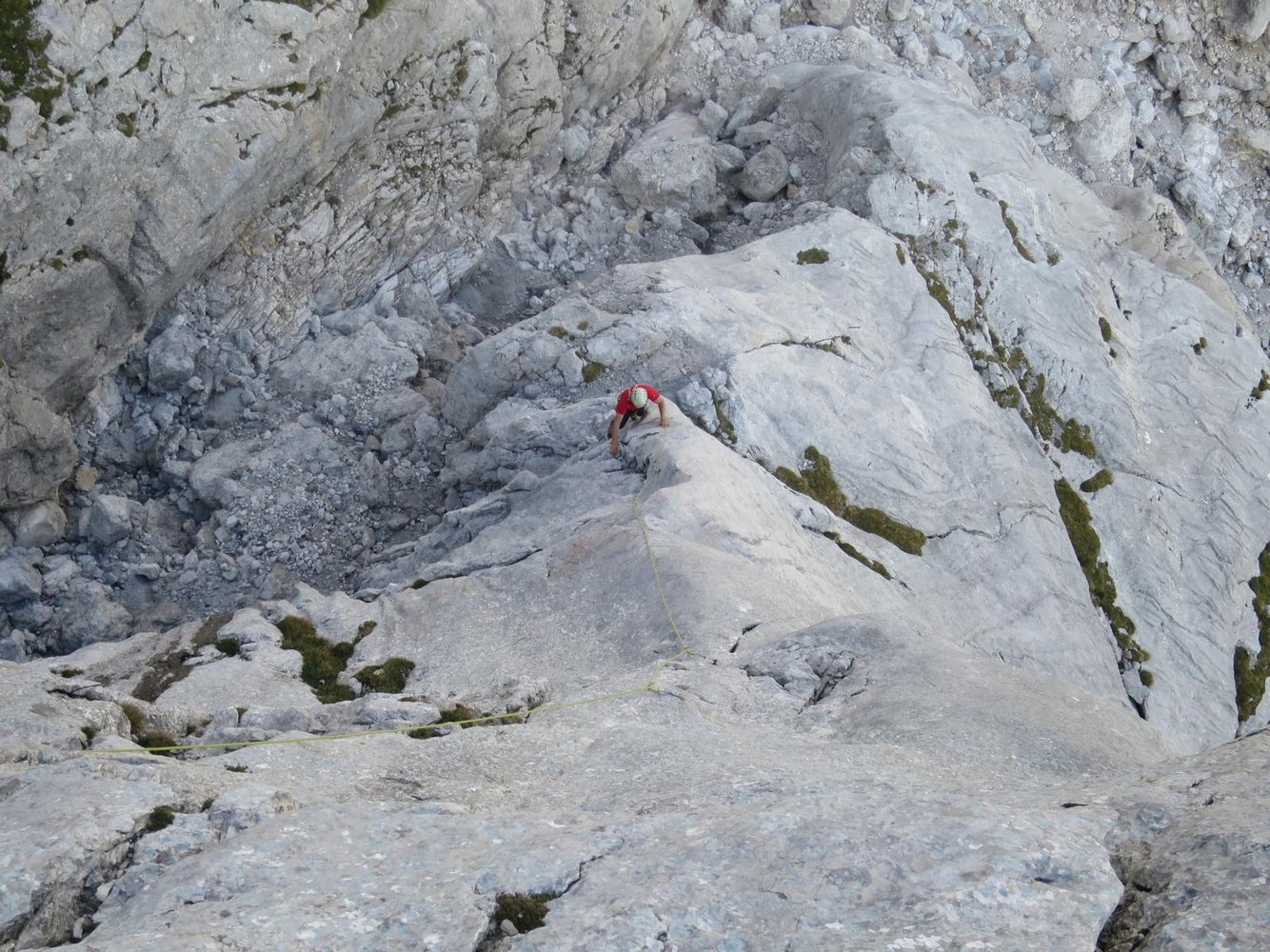 Durch ein Geröllkar nach der Waldgrenze hinauf. Der Weg verliert sich kurz auf einer Wiese unter der Stangenwand, man geht in der ursprünglichen Richtung leicht linkshaltend weiter, nach ca. 10 min "taucht" der Weg im Geröll wieder auf. Die Ostkante ist dann gut sichtbar, man steigt erst auf fast gleicher Höhe links zum Einstieg hinüber (mühsam im Geröll, aber bei genauerem Hinsehen sind Wegspuren zu erkennen).