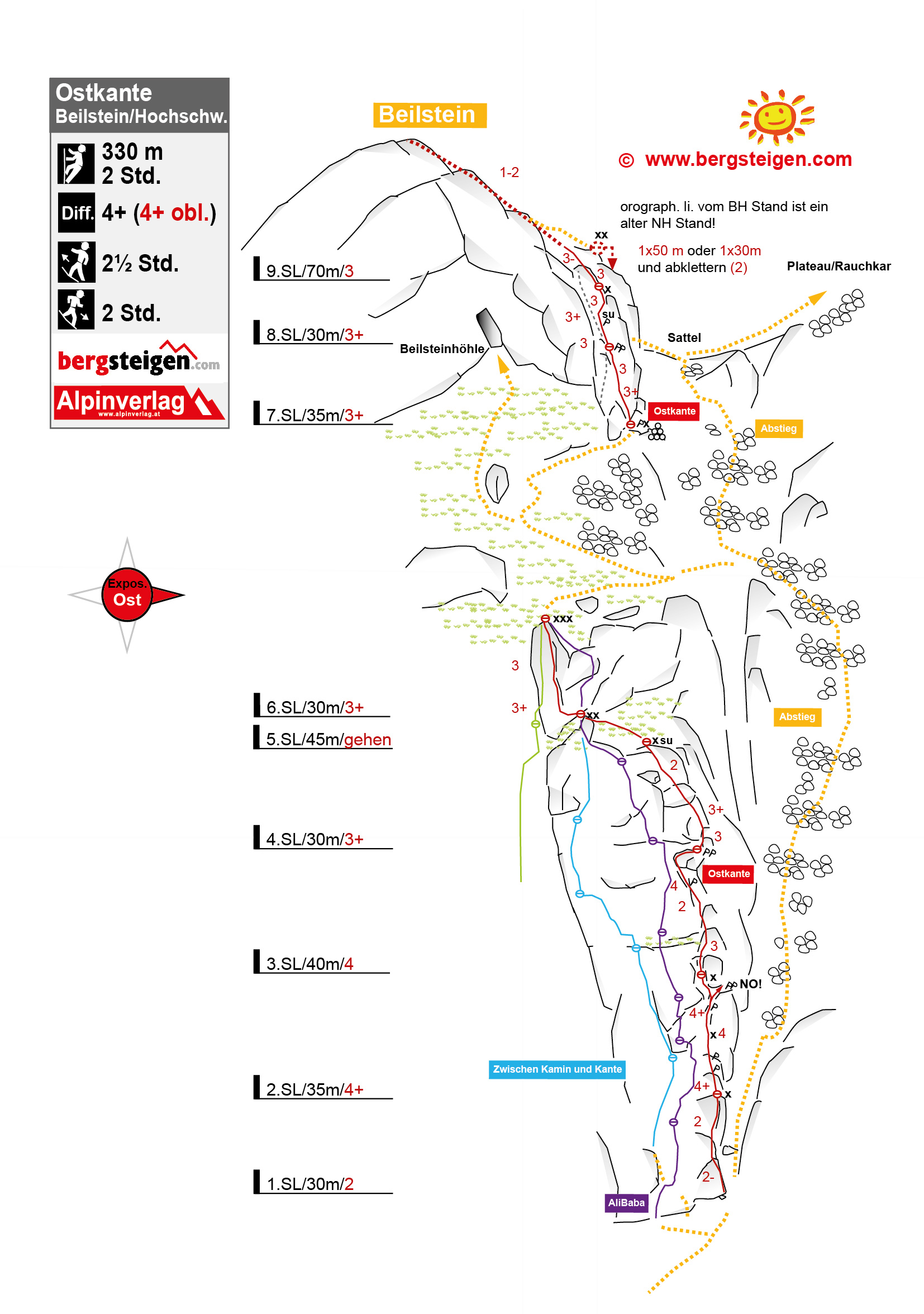 Der direkte Ausstieg (im Topo grau) wurde nicht saniert und ist derzeit nicht empfehlenswert : Dubiose, alte Haken, keine Standhaken, nur Bandschlingensicherung am Stand möglich! Der Originalausstieg ist saniert: BH rechts hinter der Kante. Wegspuren von der Rasenterasse um die Kante herum zu Stand bei Steinmann.