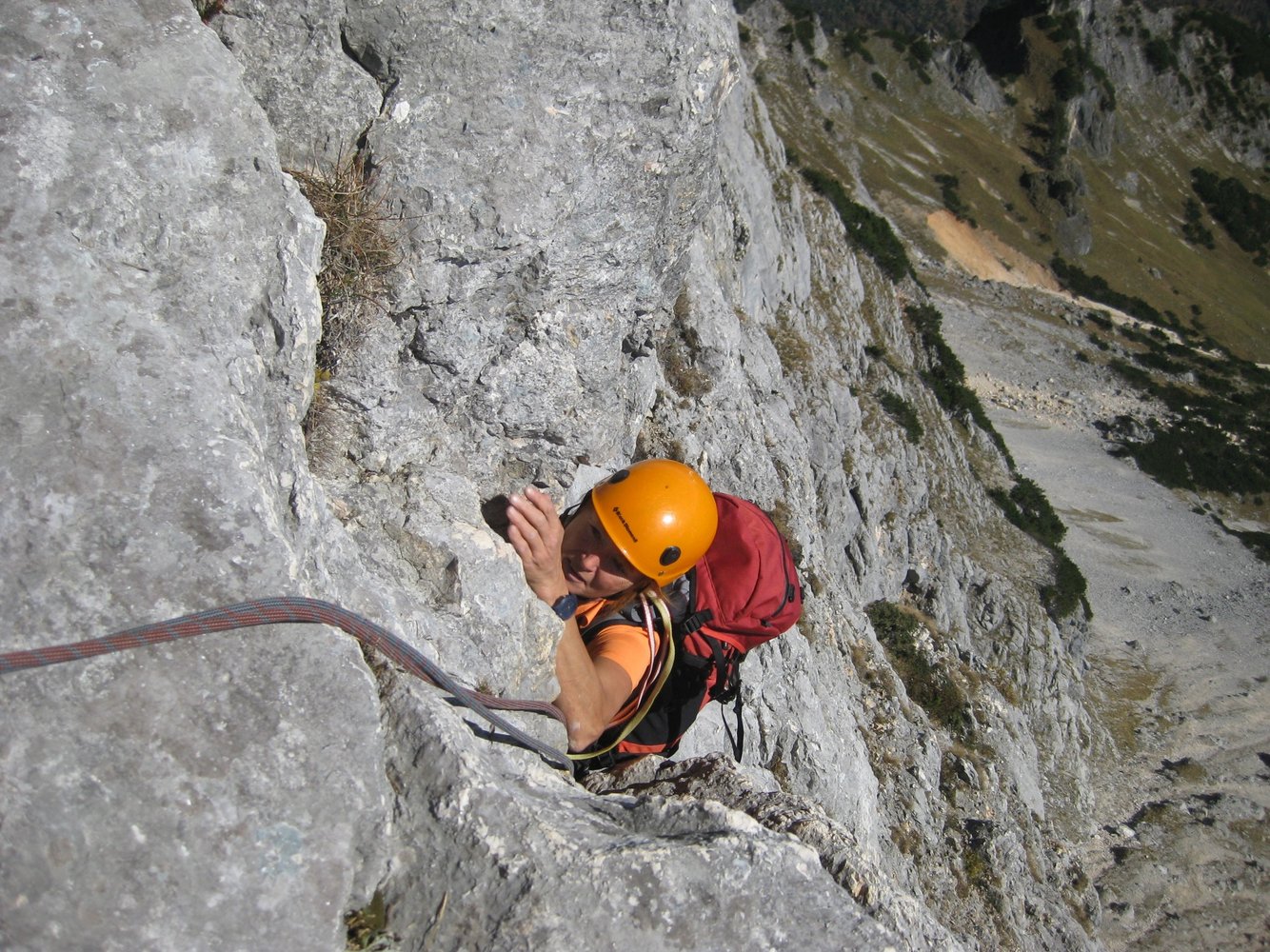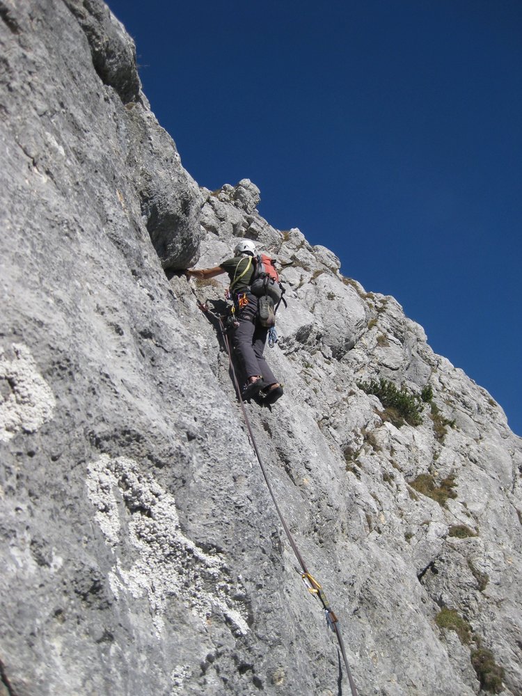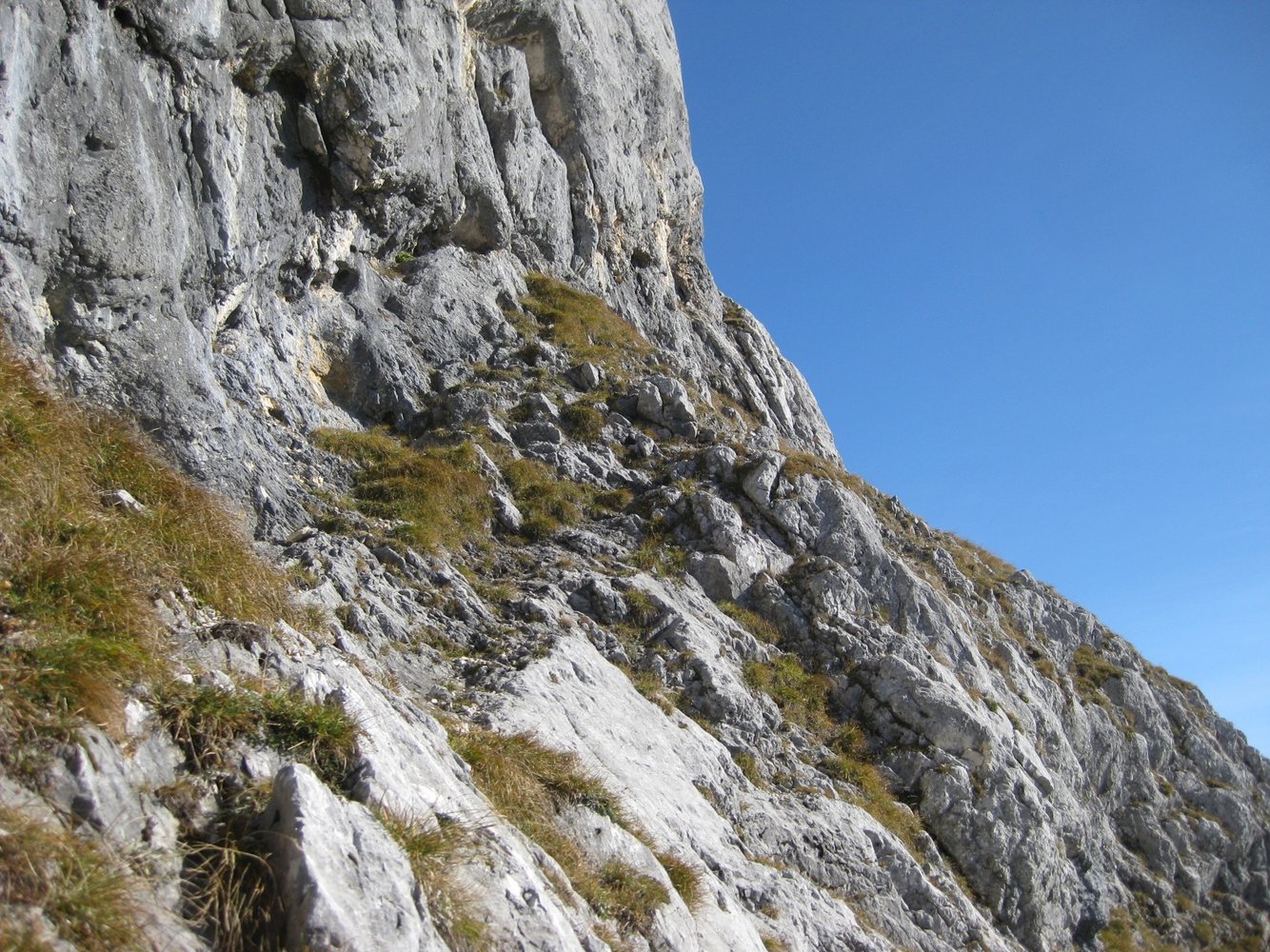pfad abzweigt. Man bleibt aber auf dem linken Pfad und steigt auf den Kamm oberhalb der Almhütte. Man quert unter den Felsen nach links und steigt dann zu einer Grasrampe auf. Auf dieser quert man steil (etwas heikel) nach rechts zum Einstieg. Dort befindet sich der Einstieg bei einem Absatz mit Ringbohrhaken.