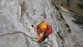 Ringbohrhaken. Im leichteren Gelände weite Hakenabstände.