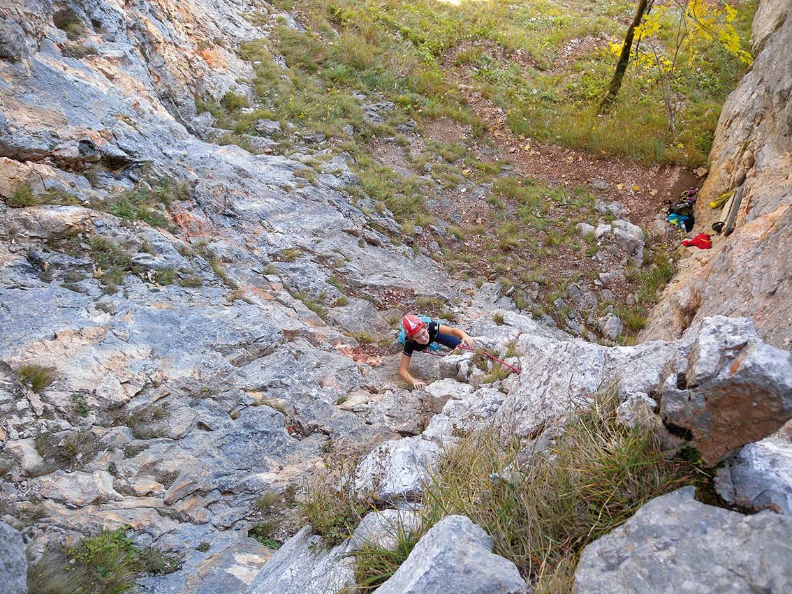 Siehe Topo. Die schwere Passage ist gleich ganz unten beim Einstieg, kurz vor dem Gipfel kommt auch noch einmal ein kurzer 2+/3- Aufschwung.