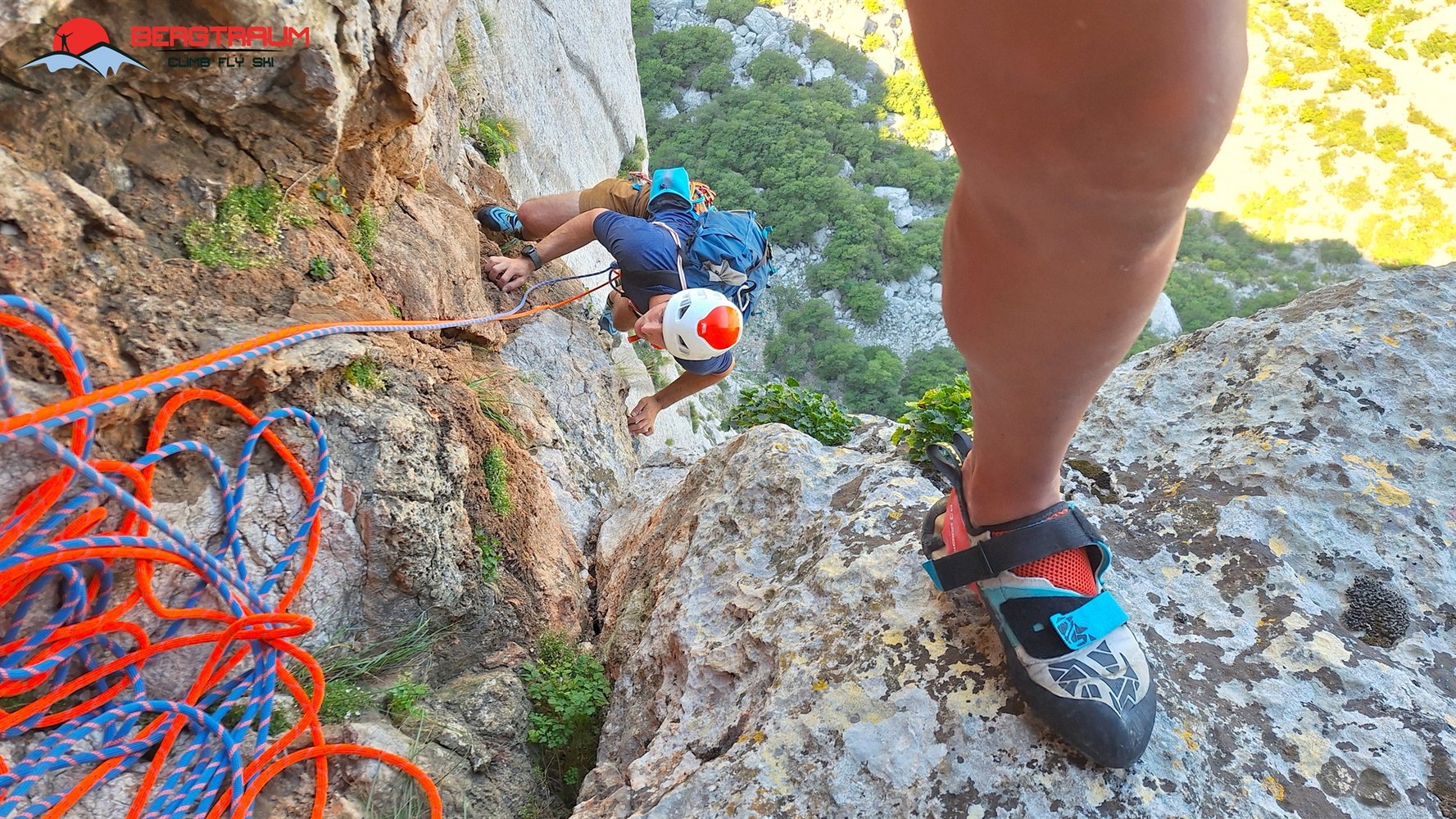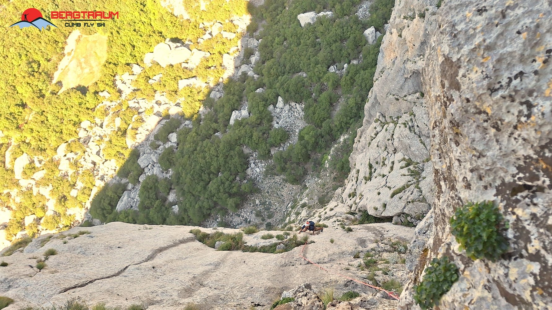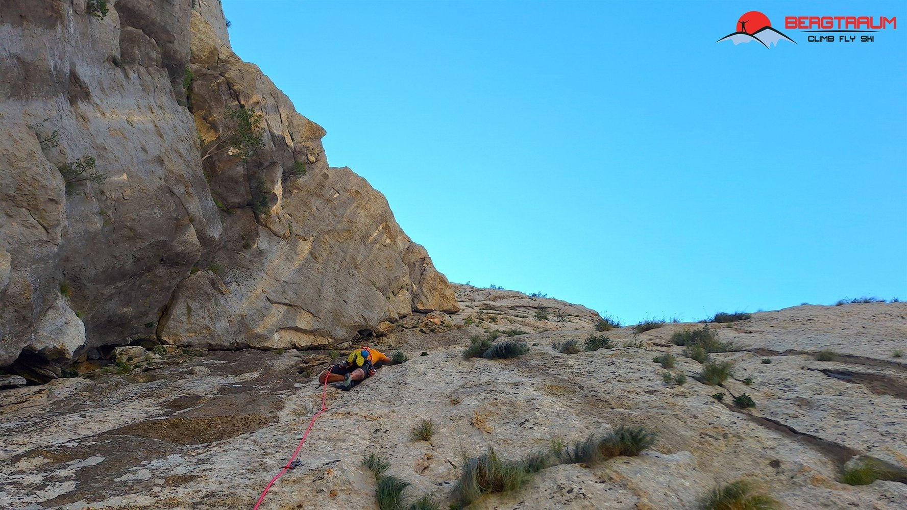 L7- 6b, 45 m: Anfangs senkrecht über Platten rauf, dann mit einer Rechts- Linksschleife direkt in die riesige Verschneidung rein. Die Verschneidung weiter, über einen großen Klemmblock drüber zum Standplatz rauf.