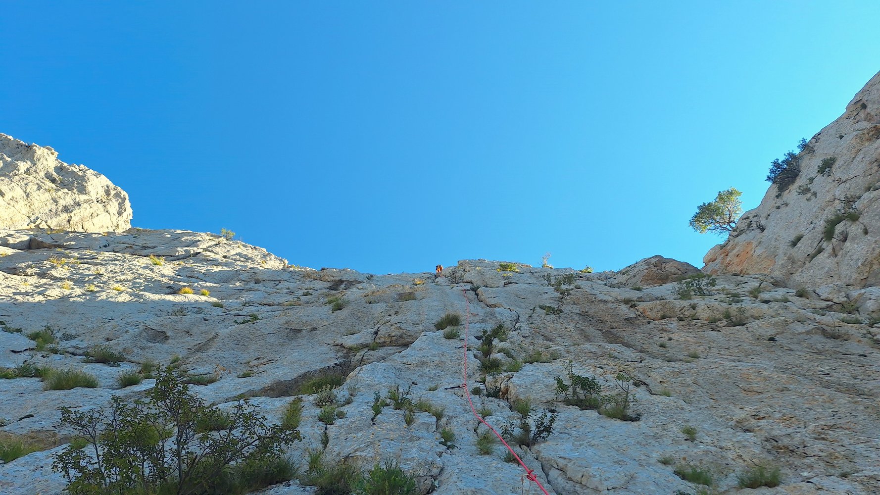 L1- 6a, 45 m: Gerade hinauf und weiter leicht linkshaltend zu Stand.