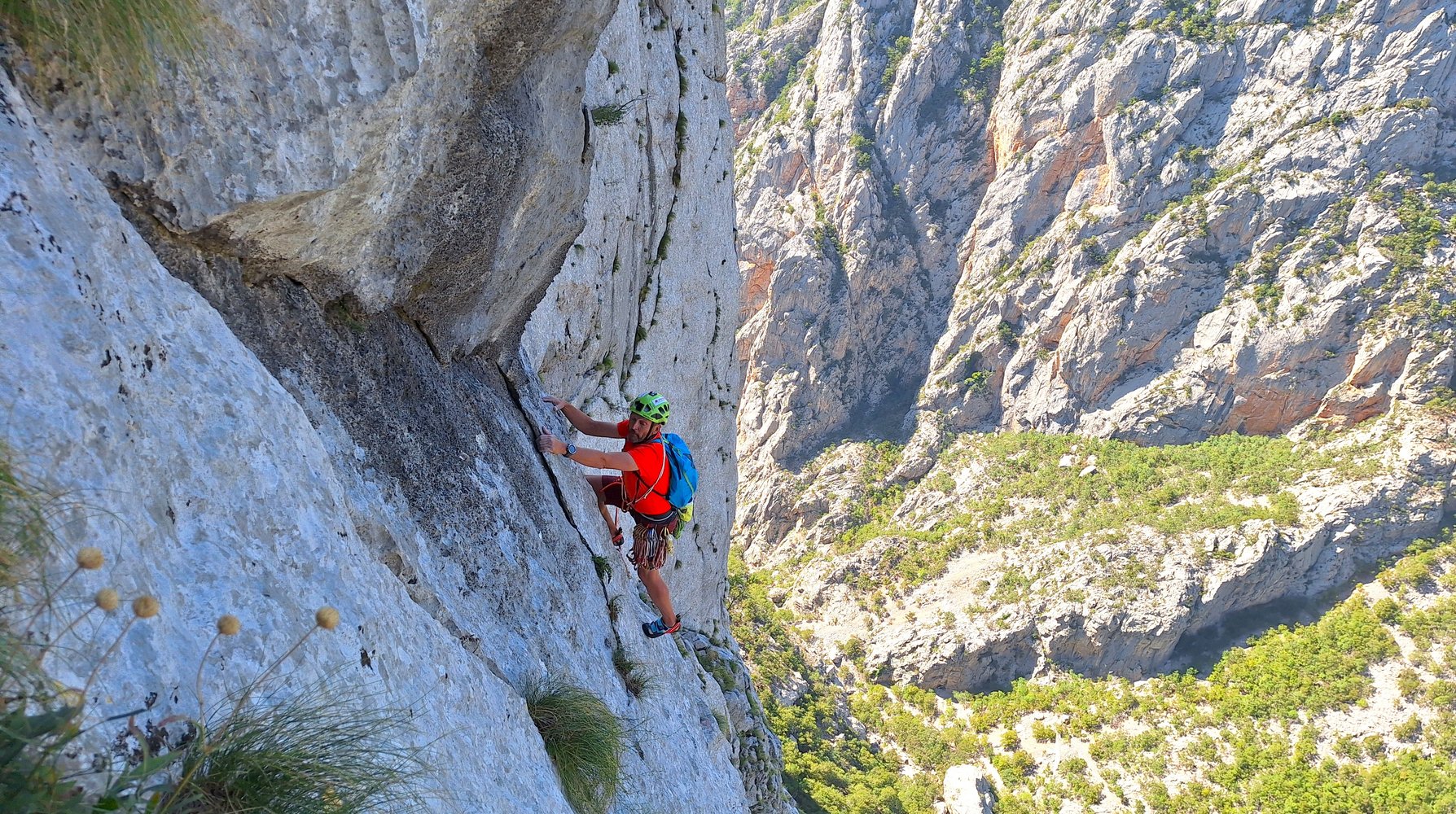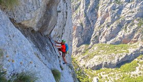 L6- 6b+, 35 m: Herrliche Plattenlänge senkrecht rauf.