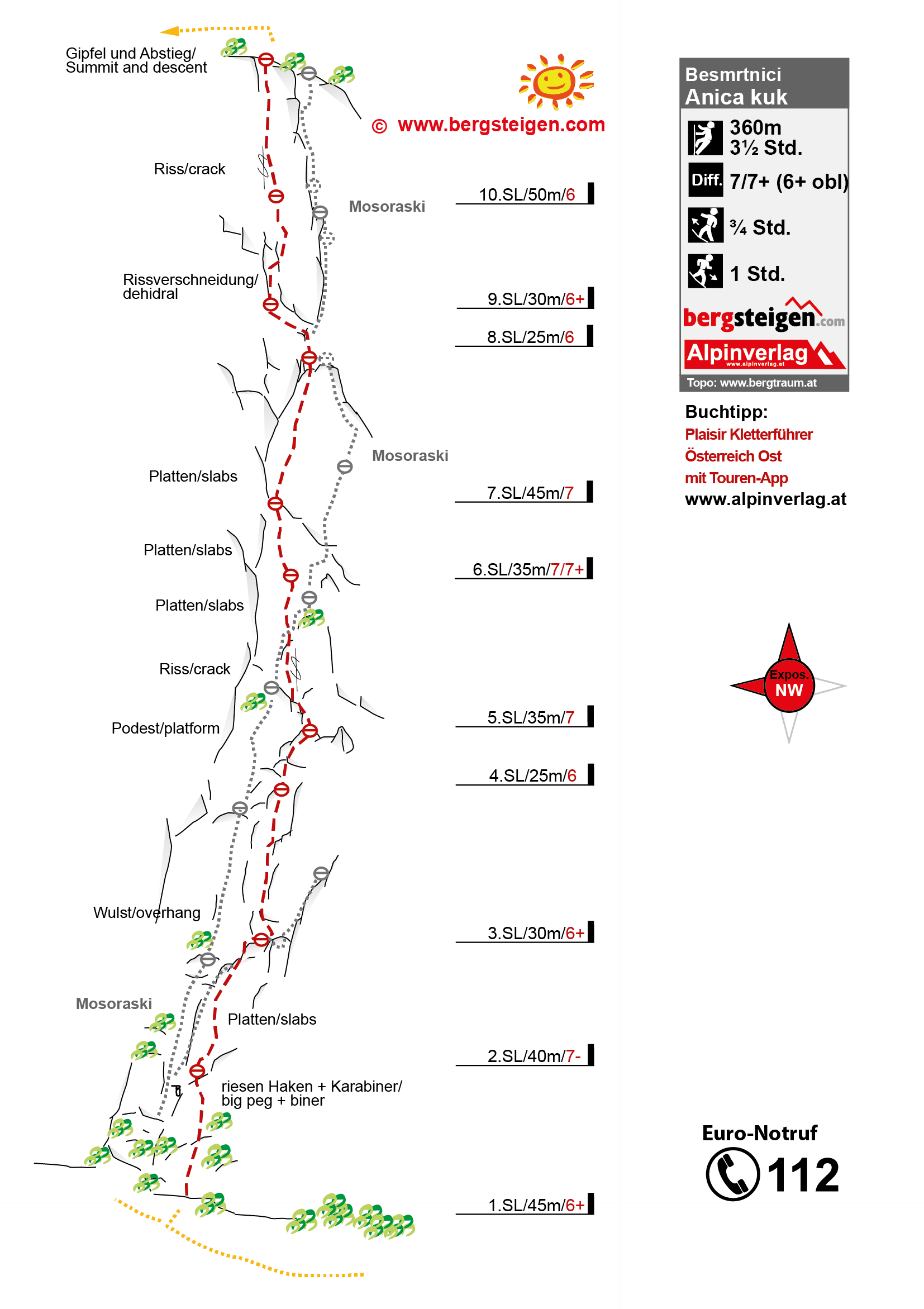 Eine interessante neue Tour durch den Sektor „Trapez“ des Anica Kuk vom kongenialen Duo Cujic/ Matkovic. Die Route beginnt rechts der Mosoraski, quert diese im oberen Mittelteil und endet links davon. Konstante Schwierigkeiten und eine sehr gute Absicherung machen die Mitnahme von friends überflüssig. Traumhafte Seillängen im oberen Teil!