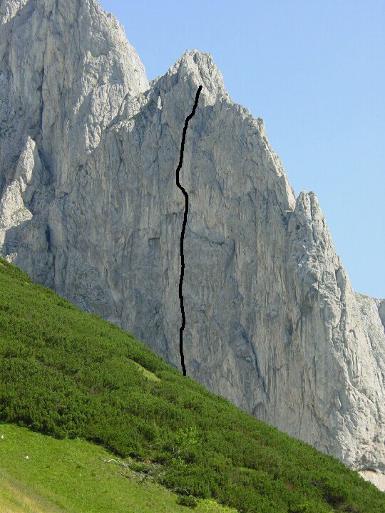 Vom Ausstieg über den Westgrat zum Gipfel und von der Schartenspitze östlich abklettern (1 - 2) in Scharte und nördlich durch eine Schlucht abseilen. Dann über Zustieg zurück.