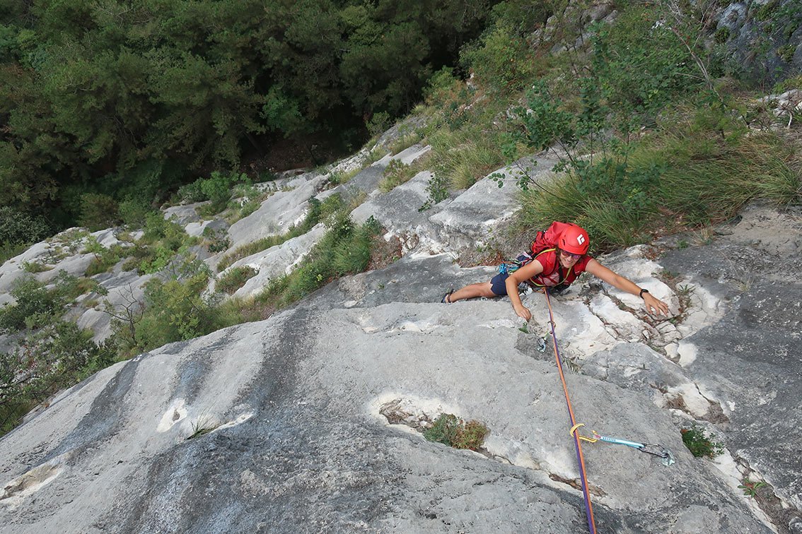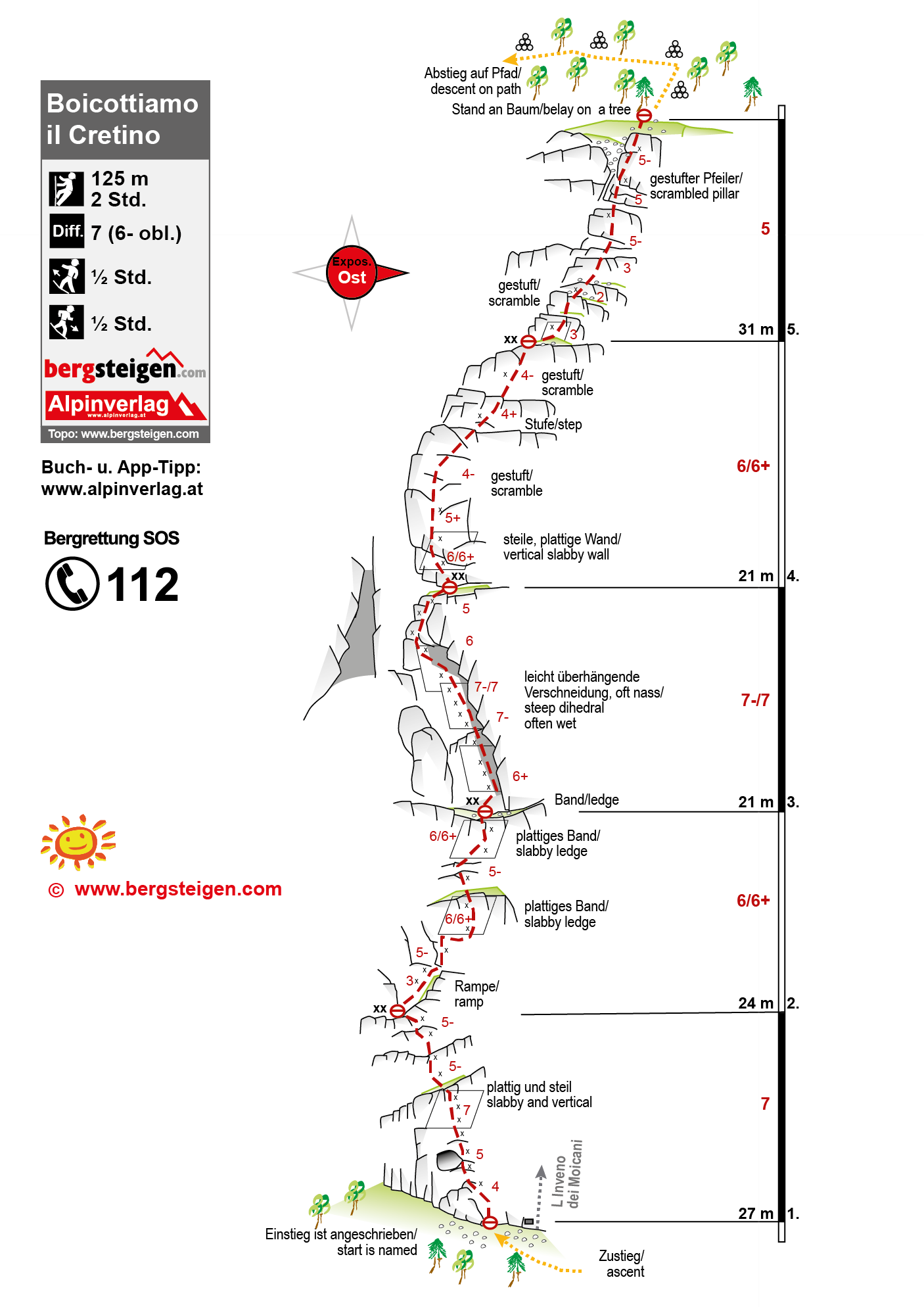 Die Route Boicottiamo il Cretino ist eine gute Tour für trockene Tage, aber auch im Hochsommer ist am Nachmittag der Schatten schnell in der Felswand. Die schweren Seillängen sind sehr üppig mit Bohrhaken ausgestattet, so kommt man auch bei Nässe sehr gut über die raue Schlüsselstelle. Am meisten Spaß macht die Tour aber bei trockenen Verhältnissen, bei Nässe (man sieht von unten gut in die dunklen, oft feuchten Wandpassagen) ist der Anstieg nicht zu empfehlen. Gesamt eine gute, kurze Mehrseillängentour!