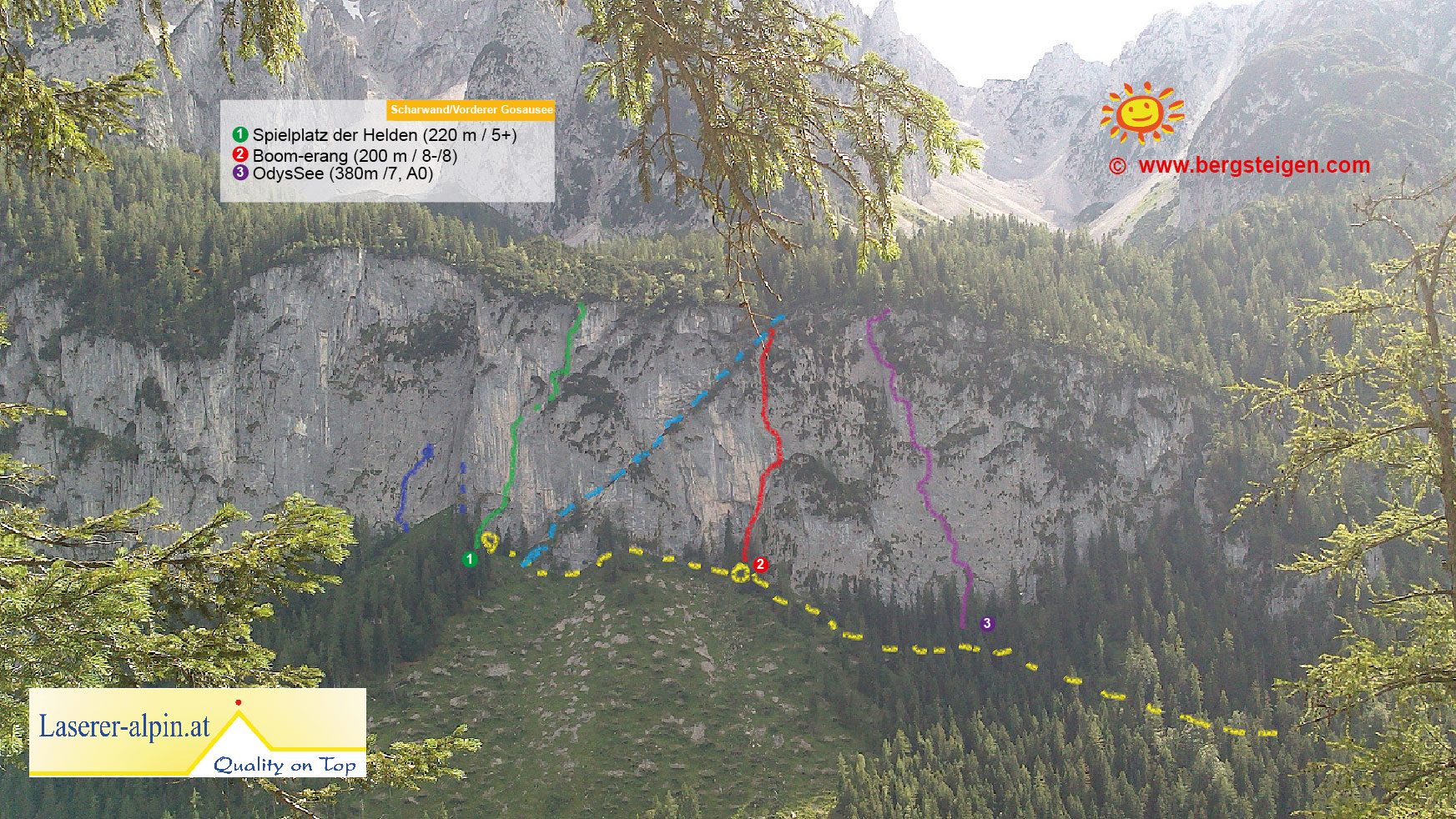 Zwei Möglichkeiten: 1. Entweder direkt beim Abstieg links die "Diagonale" abklettern, I bis II, (bei Nässe nicht ratsam!) Und zurück zum Einstieg. 2. Oder direkt vom Ausstieg in 10 Min. durch den Wald gerade hoch bis zur Scharwandalm Hütte. Von dort den markierten Wanderweg "Steiglweg" zurück zum Gasthaus Gosausee.