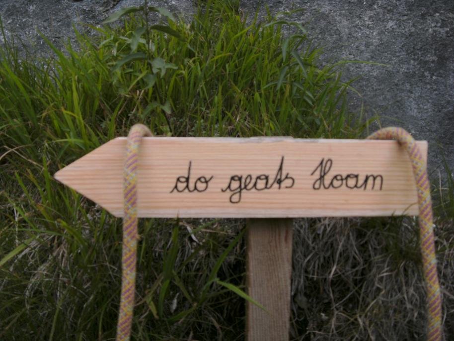 Vom Parkplatz bis zum Einstieg des Klettersteiges. Dort nach rechts der Wand entlang - zuerst auf-, dann kurz absteigen - bis in eine Schutthalde. Dort befindet sich ein altes kleines Eisenkreuz (Josef Klotz) an der Wand. Unmittelbar rechts davon (roter Pfeil; Tafel) geht es zur Sache.