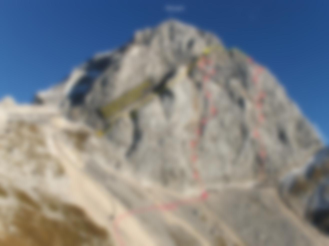 Eine weitere, moderne und schöne Klettertour an der Westwand des Mangart. Die Route ist sehr abwechslungsreich, führt vorwiegend über kompakte Platten, aber auch Verschneidungen und Wandkletterei. Die Absicherung mit Bohrhaken ist ausreichend, aber keinesfalls mit der im Klettergarten zu vergleichen. Deshalb sollte der Grad 6b souverän geklettert werden können. Die Schlüsselstelle ist gut abgesichert. Wie bei allen Touren der Westwand gilt auch hier: Nicht zu früh einsteigen, es kann auch im Sommer seeeehr kalt sein!