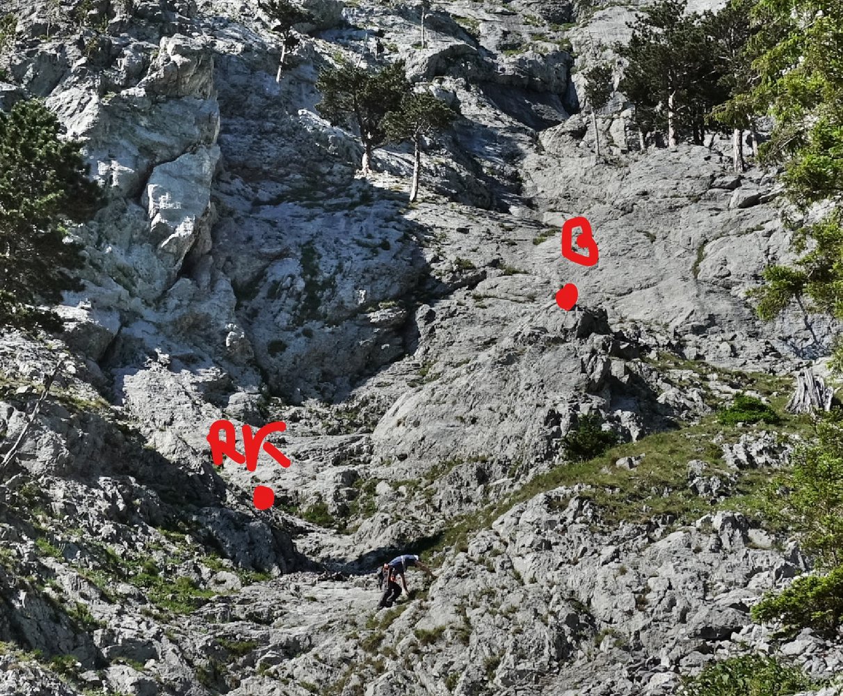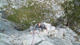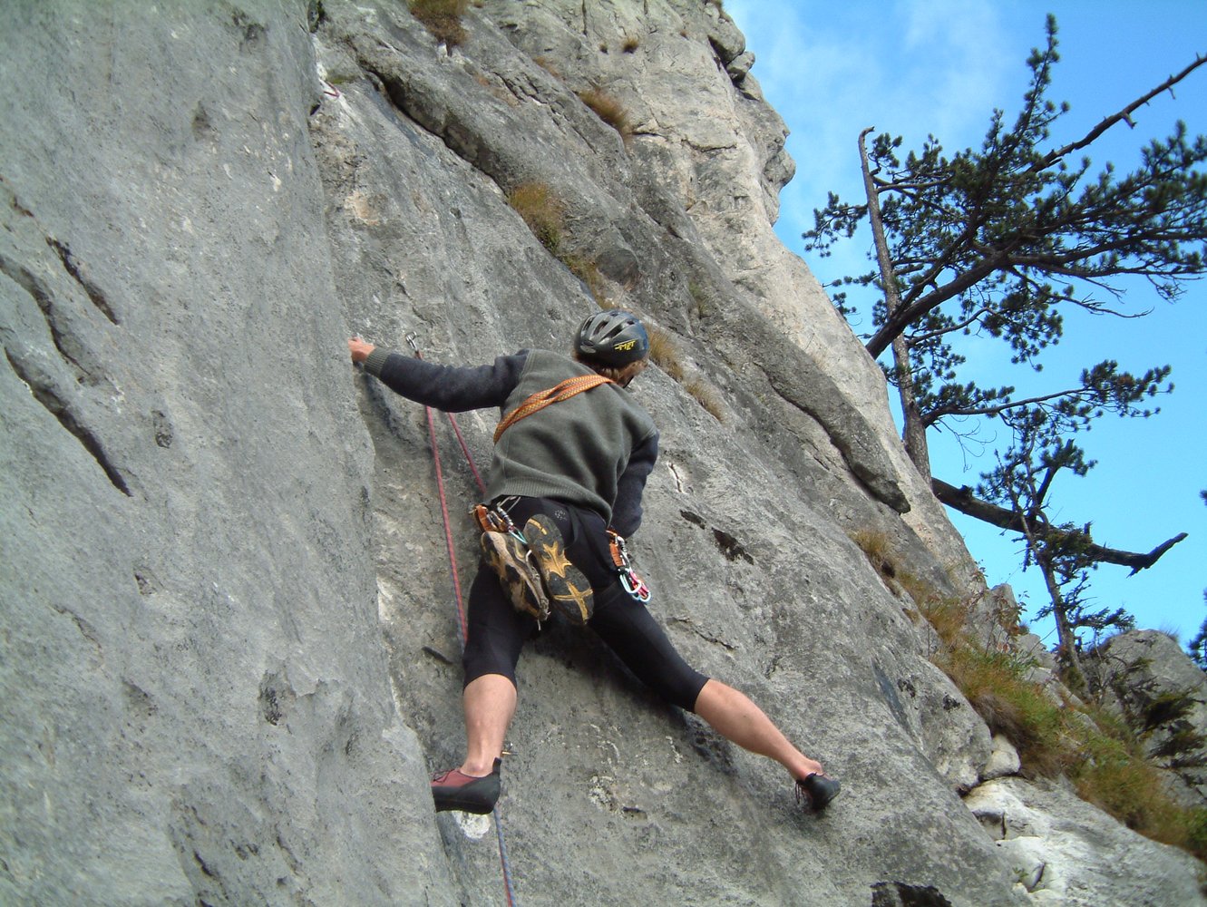 Die Route gut mit Bohrhaken (Bühler und alte Schwerlastanker), fixen Sanduhrschlingen und einigen Baum- und Köpfelschlingen ausgestattet. Die Hakenabstände sind aber fallweise weiter und das Material stammt noch von der Erstbegehung (d.h. älter).