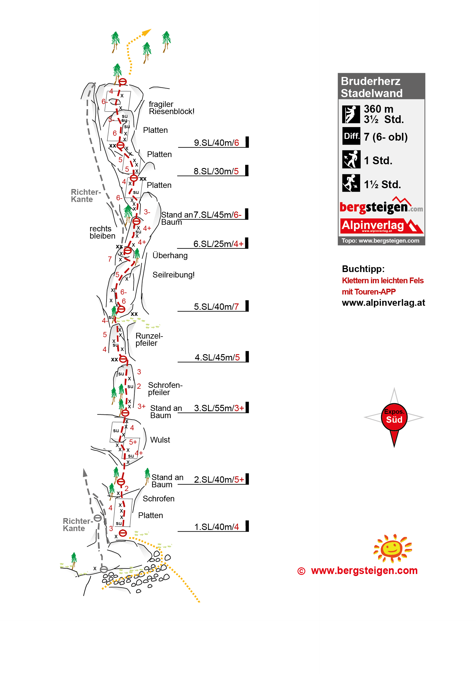 Höllental-Bundesstraße, Parkplatz zwischen Weichtalhaus und Hochstegbrücke. Vom Parkplatz den Weg in den Stadelwandgraben, vorbei an der Sexquelle. Der Weg verlässt dann den Stadelwandgraben (Geröllhalde unter der Wand) und geht im Zick-Zack auf einem Rücken empor. 100 Hm vor dem Sattel, wo der Weg wieder nahe an die Geröllhalde kommt, quert man über diese zur markanten Kante. (Richterkante) (Einstieg in der Falllinie der Kante bei Ringhaken) Der Einstieg der Bruderherz ist 15m weiter rechts oben.