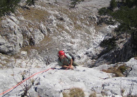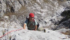 Einfachseil 50 m, 8Expr. Schlingen, 2 lange Bandschlingen, Klemmkeile und HELM! nicht vergessen! Die Standplaetze sind mit Klebehaken eingebohrt oder an Bäumen.
