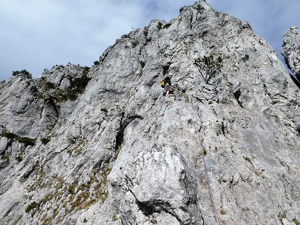 Vom Ausstieg folgt man noch 6 Seillängen dem Stadelwandgrat 3 bis zur 'Märchenwiese' mit einer Huette, von der man auf (gelb) markiertem Steig rechts unter die Wand zurueckkehren kann.