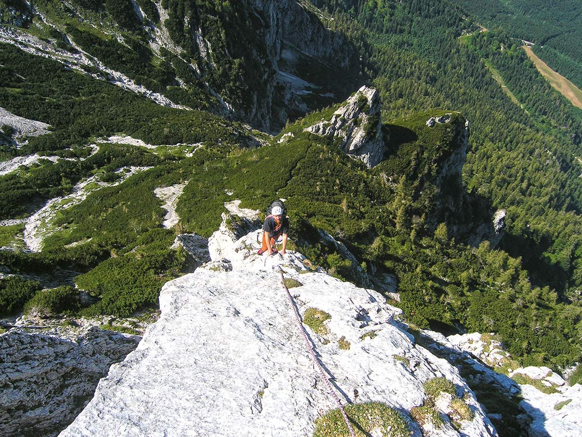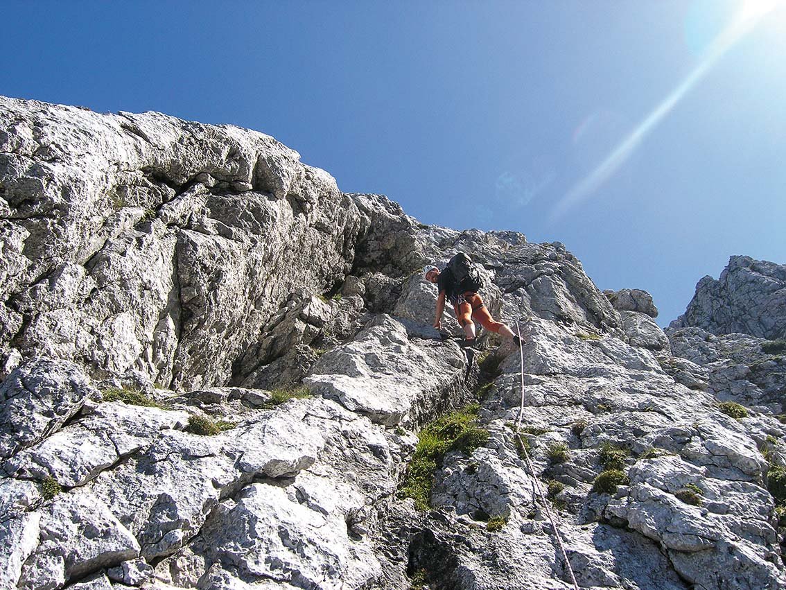 Schöne, anregende Gratkletterei in überraschend gutem Kalkfels, an der Nordostseite des Höllengebirge-Plateaus.