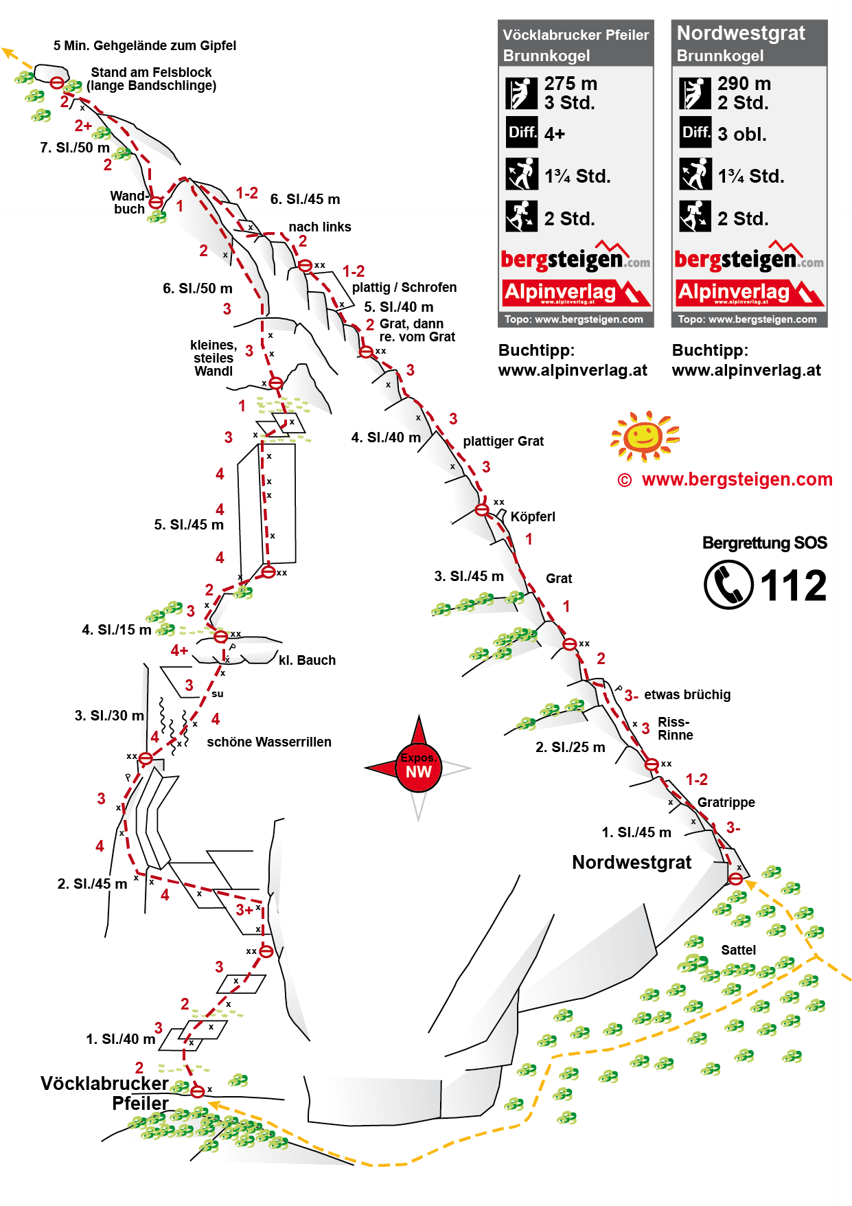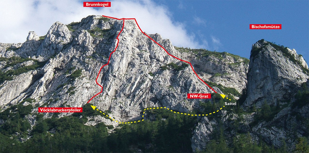 Siehe auch Topo. Logische Route über die Rippen des „Nordwestgrates“, der von der Bischofsmütze (1446 m, vorgelagerter Doppelturm mit kleinem Gipfelkreuz) zum Brunnkogelgipfel hinaufzieht. Ausstieg auf dem unmarkierten „Franz-Scheckenberger-Steig“ kurz vor dem Gipfel.