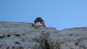 Wenige Meter 3+ bis zum 1. Bolt in der letzten Seillänge, eine 3er Stelle im Spalt und einige 3- Stellen, sonst leichter.