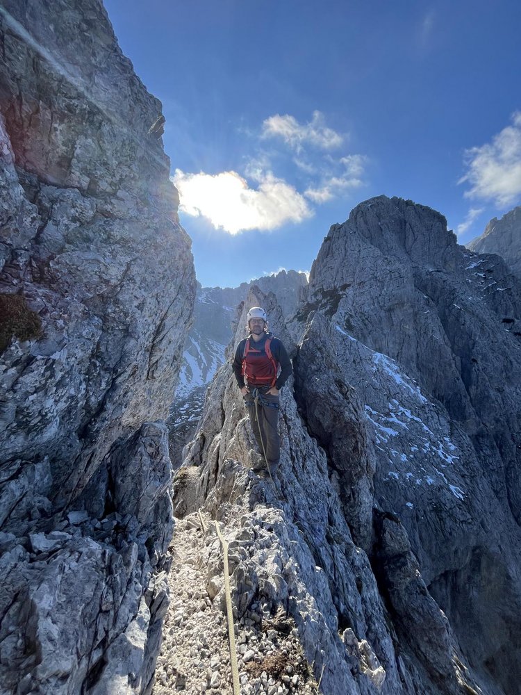 Was ist aber fix? Es handelt sich um eine supercoole Linie, die a.) guten julischen Fels beinhaltet und b.) wahnsinnig gute Bewegungsmuster abverlangt. Von Platten-, Schuppen-, Kamin- und Risskletterei ist alles dabei und an den wichtigsten Stellen sind auch Haken vorhanden. Zudem kann man die Route gut mit mobilen Sicherungsgeräten ergänzen. Zurück zum Kamin: Es sind im unteren Teil einige Abseilstände eingerichtet, da der oder die Eine offensichtlich Rückzug gefeiert hat (Siehe Topo). Die tolle Route in Kombination mit lässigem Gipfel (scharfer Grat) und forderndem Abstieg (siehe Track) ist ein absolutes Highlight der Weißenbachgruppe und den Juliern insgesamt. Großes Lob an die Erstbegeher und viel Spaß beim Wiederholen. Über einen Kommentar zur Schlüsselänge nach dem Kamin wäre ich sehr erfreut!