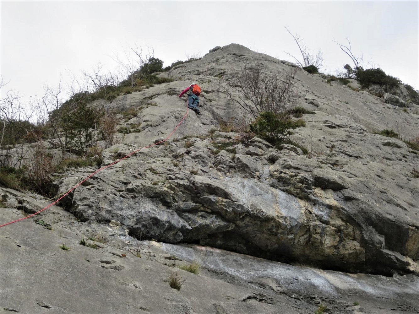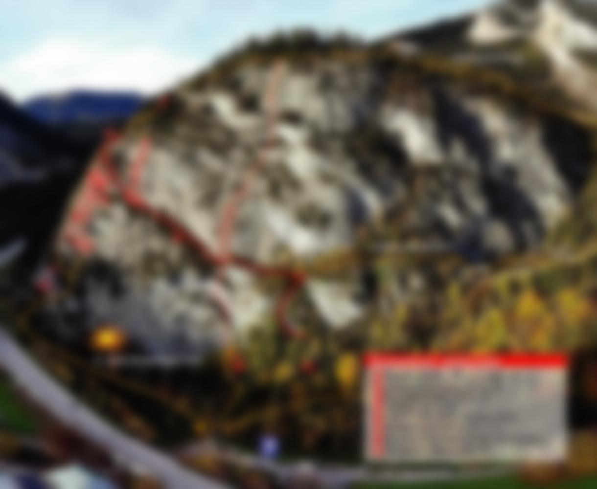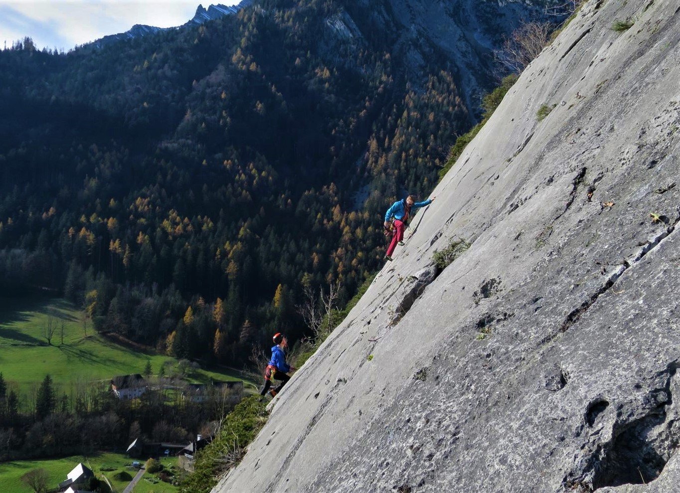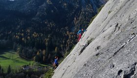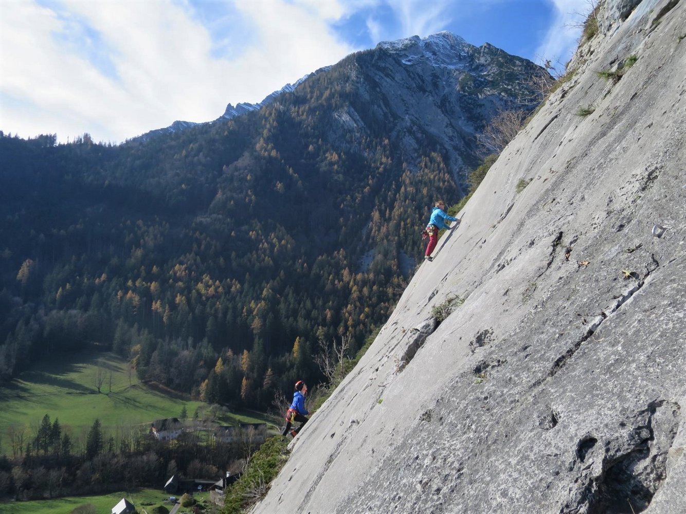 Die direkte Var. in der Vorletzten Seillänge ist 5-, die 4er Länge rechts hat im 3er Gelände einen weiteren Runtout (Hakenabstand)