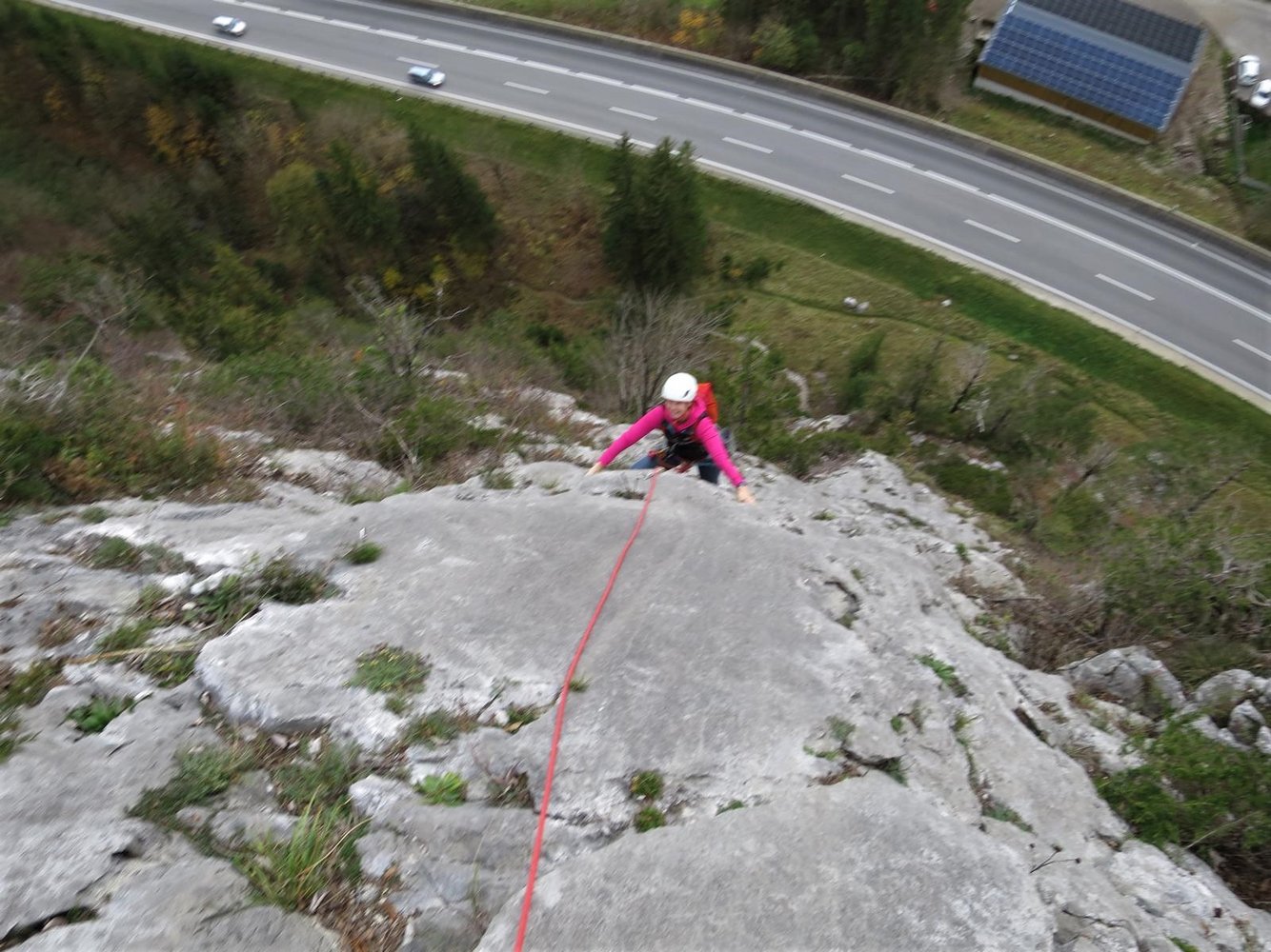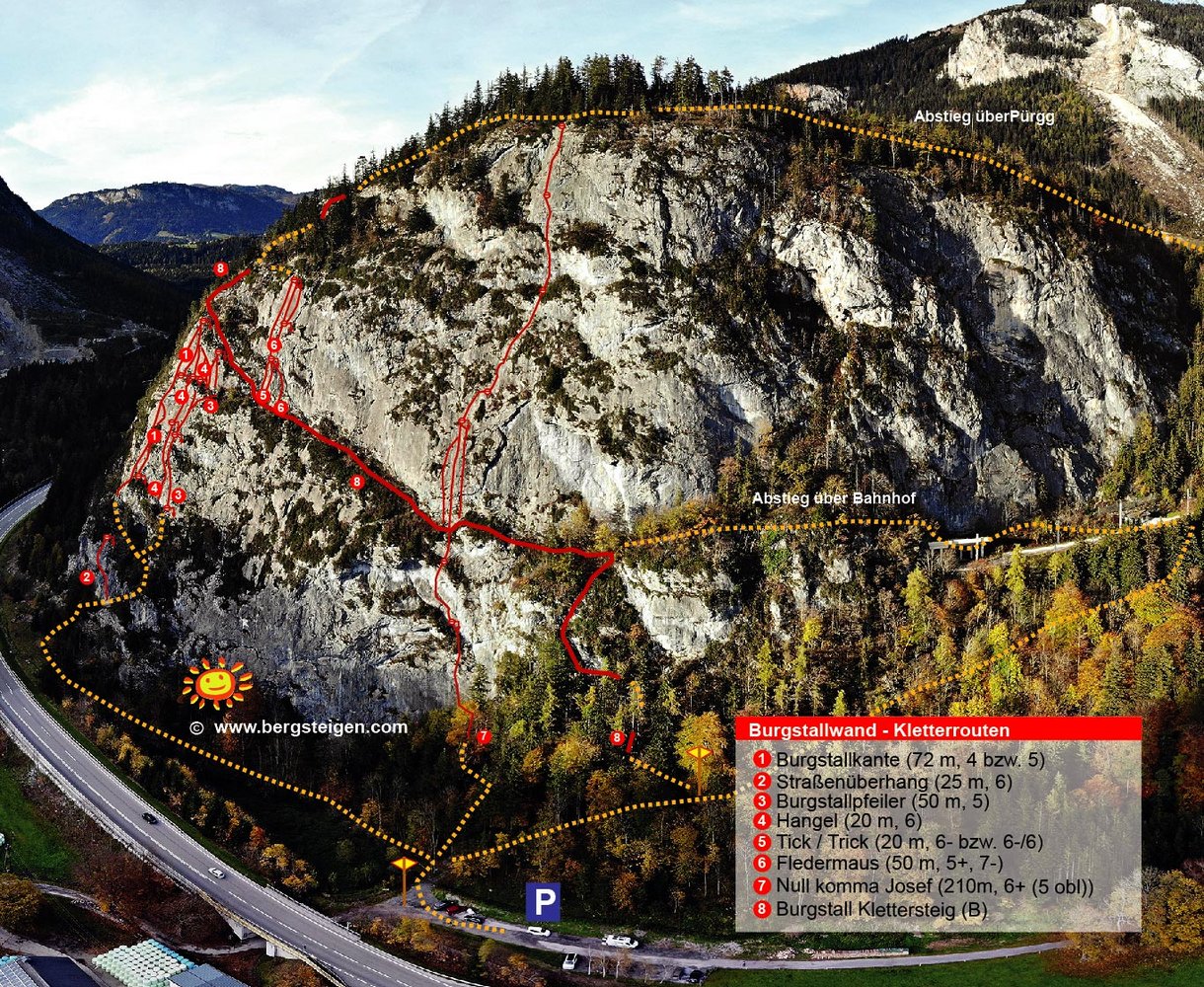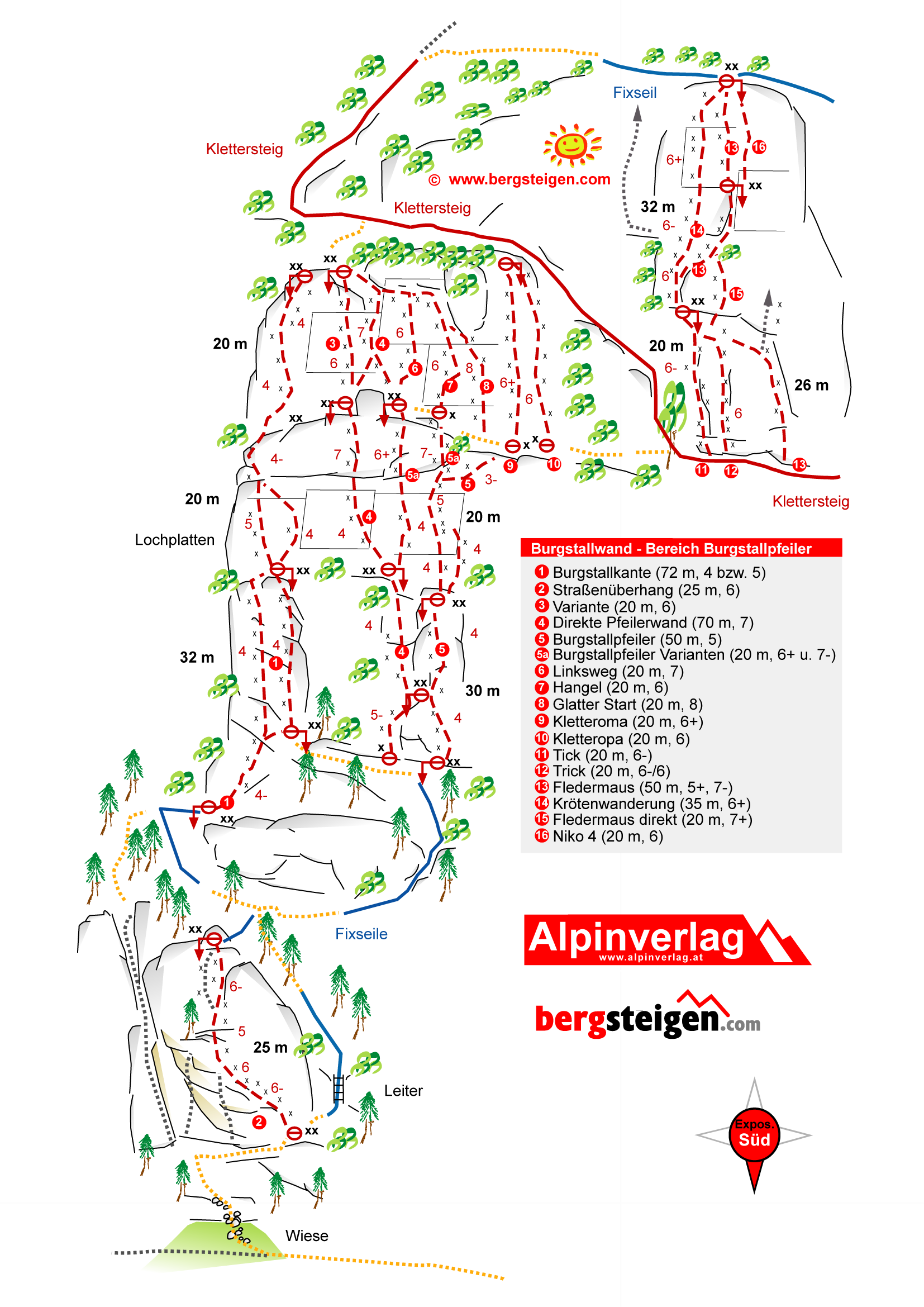 Der linke Bereich der Burgstallwand beheimatet die leichtesten Touren dieses Klettergebiets. Die Burgstallkante ist ein großartiger 4er mit Varianten und bietet sensationelle Kletterei an griffigen Platten, wenn da nicht der störende Straßenlärm wäre, d.h. Ohropax rein und Seilkommandos auf nonverbal umstellen! Der Fels ist sensationell!