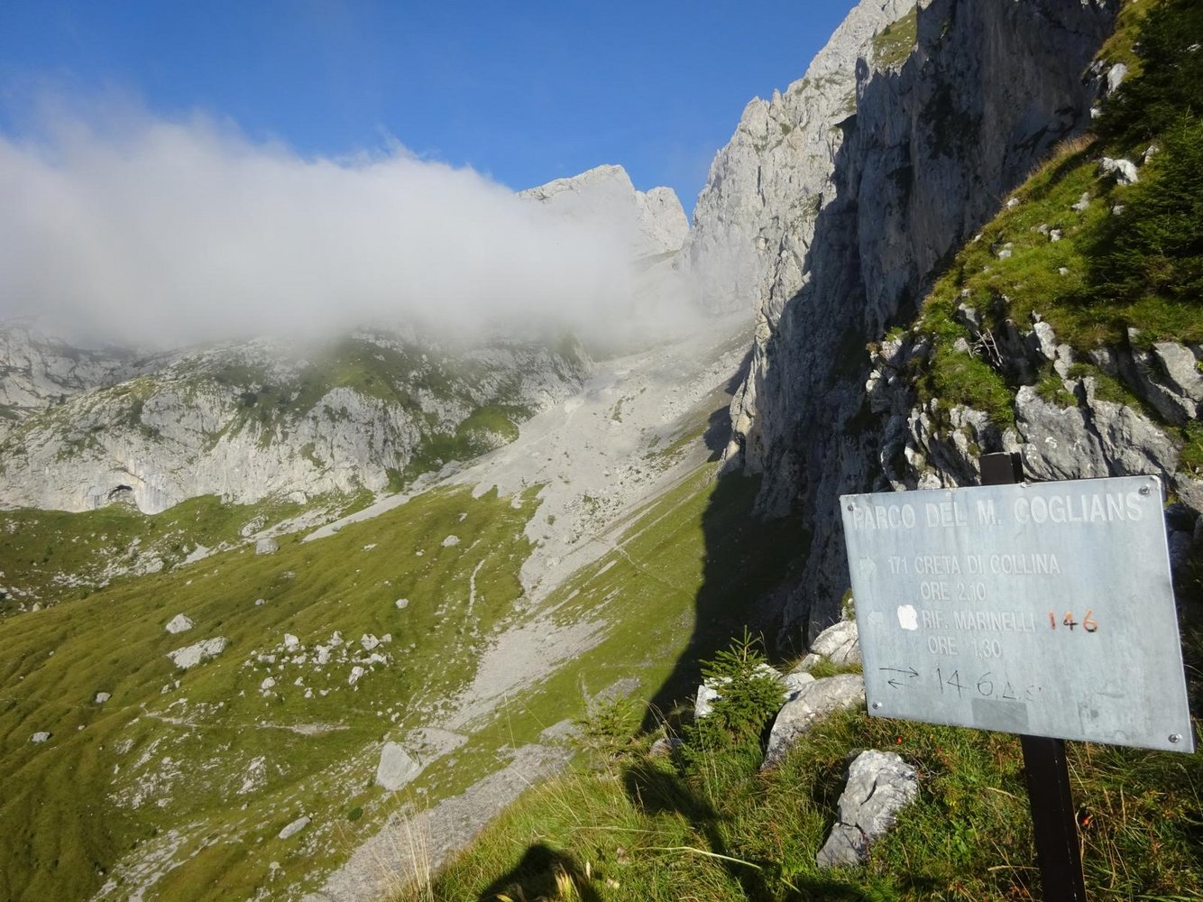 Vom Parkplatz des Plöckenpass westwärts, immer dem Weg Nr.146 folgen – nach etwa einer Stunde bei einer Weggabelung kurz einmal durch ein seilversichertes Felsloch absteigen (immer noch Weg Nr. 146) – bis auf etwa 1800m Seehöhe. Dort auf Steigspuren das Schotterkar hinauf bis zum Wandfuß. Der Einstieg befindet sich etwas rechts des bekannten Pilastro del Plote, rechts des markanten Turms (siehe Wandfoto).