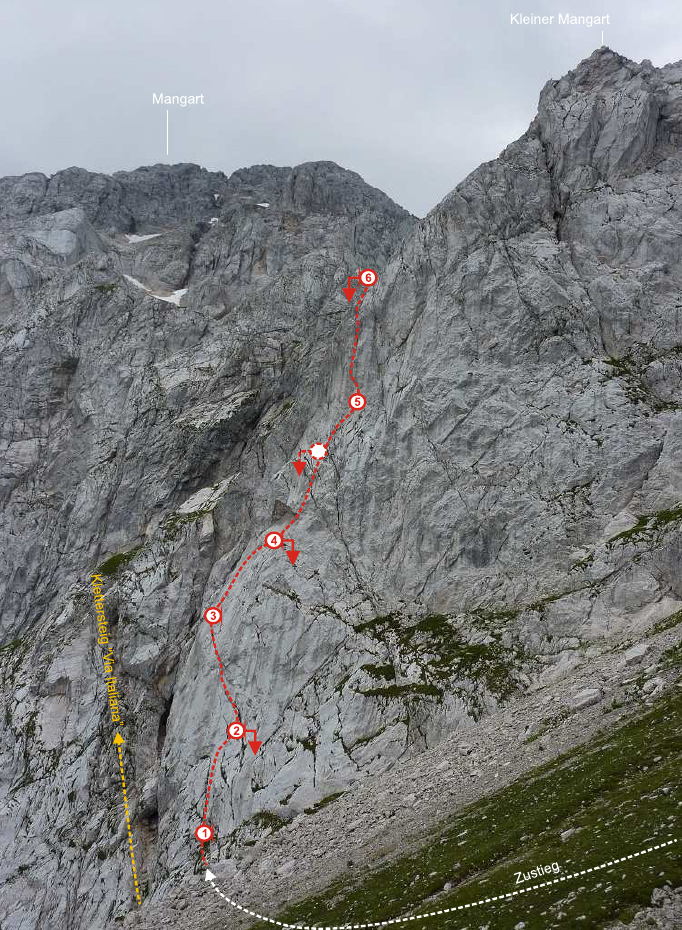 Für einen Überblick über die anderen Routen in der Wand gibt es hier gute gute Seite: http://www.primorskestene.com/koritnica/mangart/ostenje-pod-mangartskami-jezeri/mali-rateski-mangart