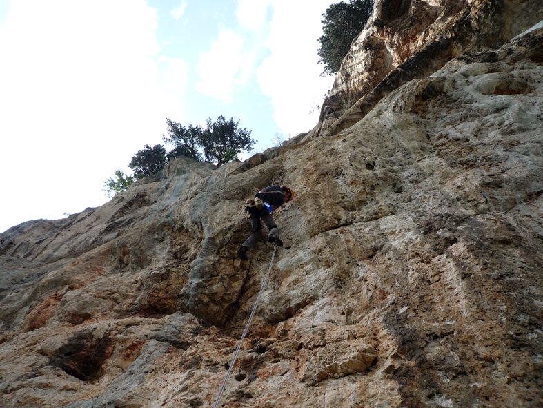 Über Wildenauer (Klettersteig D) zurück zum Einstieg. Mann kann auch mit 60 m Doppelseil vom Ausstieg bis auf den ersten Grasabsatz abseilen, man muss aber in der letzten u. vorletzten SL einige Bolts einhängen, damit man den Absatz erreicht!