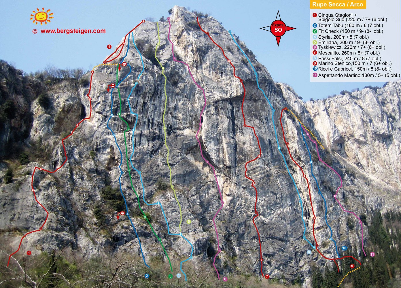 Die Cinque Stagioni und die Verlängerung über den Spigolo Sud sind eine klassische und sehr beliebte Routenkombination in Arco. Die Tour ist recht gut mit Bohrhaken gesichert, die schwere Seillänge kann man problemlos technisch klettern, so dass auch 6er-Kletterer in der Regel ans Ziel kommen. Man klettert immer oberhalb des Ortes und hat am Ende einen fantastischen Blick auf die Burg und den Gardasee. Gesamt - trotz des schon etwas polierten Felsens - immer noch eine "muss man gemacht haben" Route in Arco!