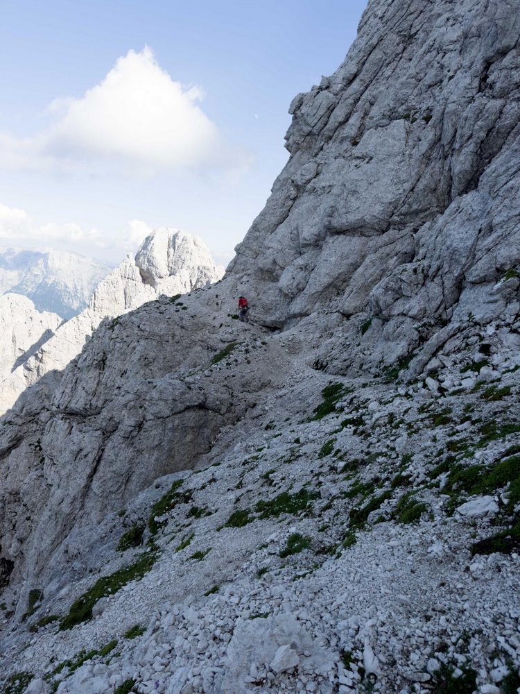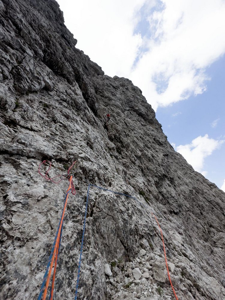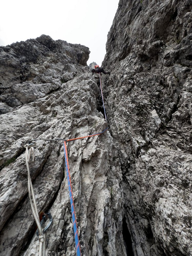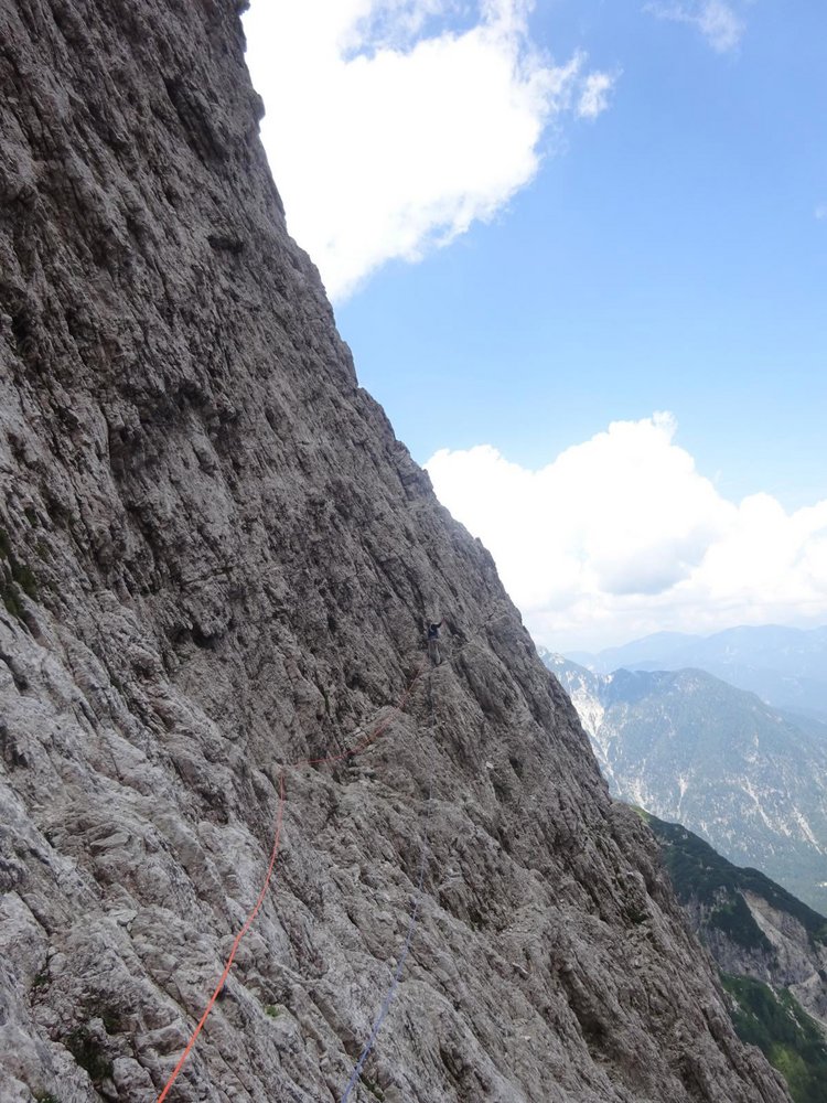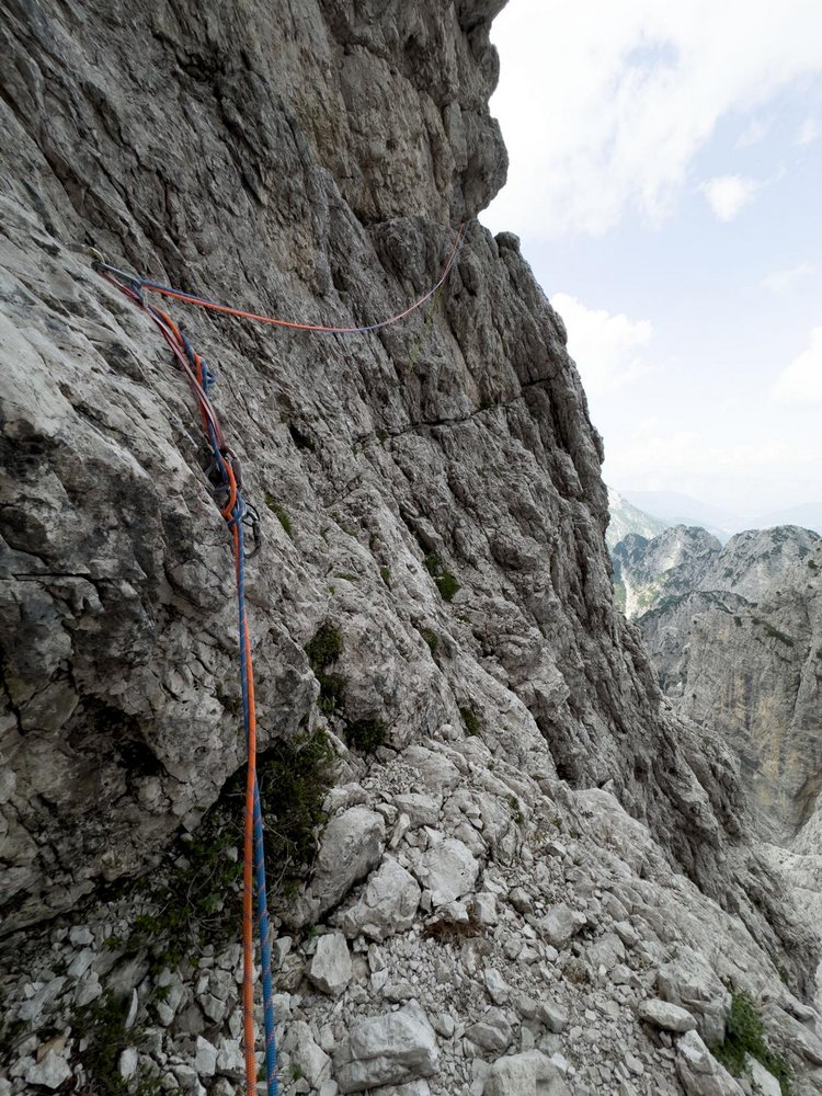 Die Comici-Fabjan, in Kärnten auch als Comici-Kante bekannt, ist eine klassische Julische Alpintour. Klassisch bedeutet, dass sie für den Schwierigkeitsgrad recht fordernd ist und dass der Fels kein Dachsteinkalk ist. Gerade in den leichteren Längen liegen lose Steine herum. Die schwierigeren Längen sind recht kompakt und lassen sich gut absichern. Insgesamt stecken in der Route wenige Haken, oft, gerade im oberen Teil, muss man auch die Stände selbst einrichten.