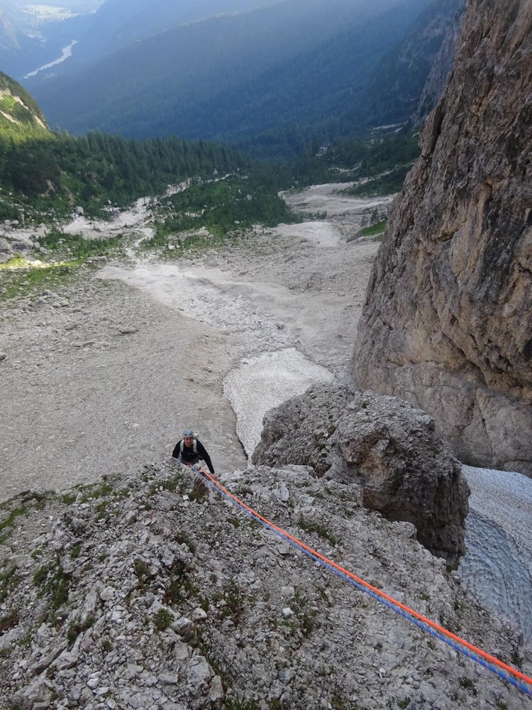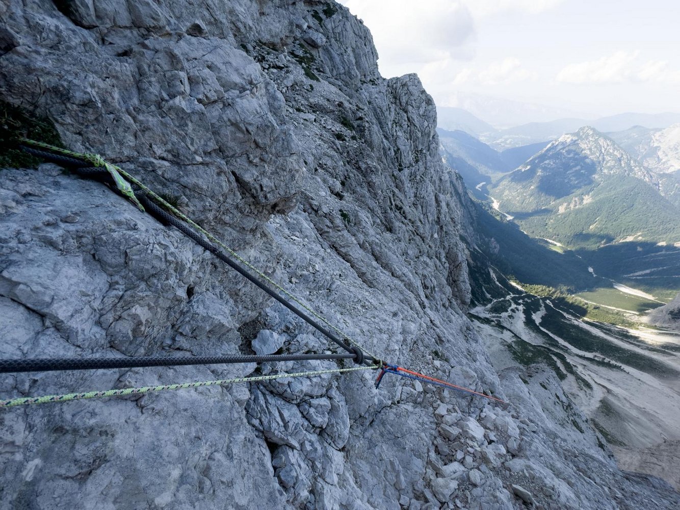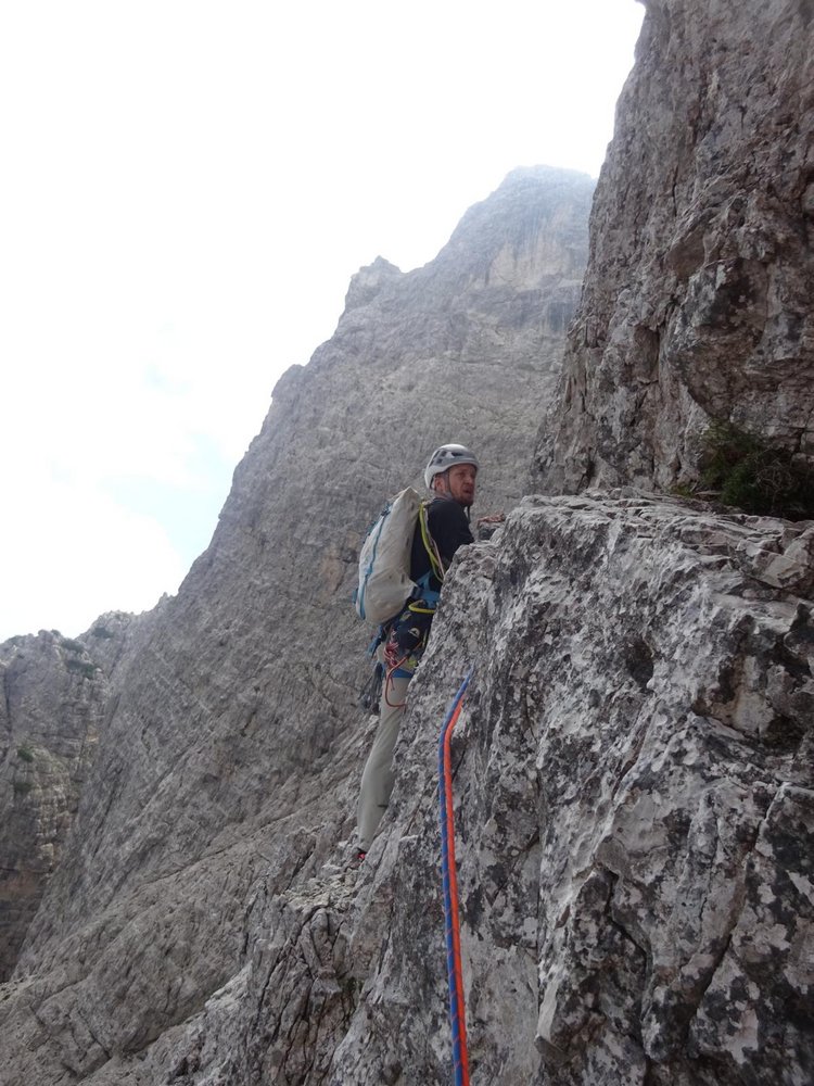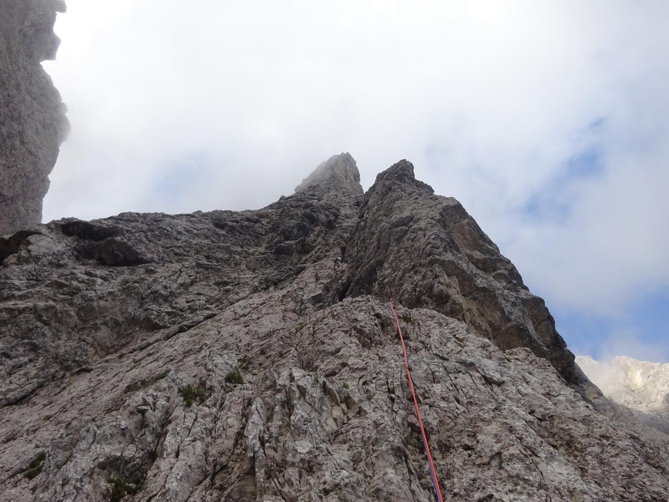 Die Comici-Fabjan, in Kärnten auch als Comici-Kante bekannt, ist eine klassische Julische Alpintour. Klassisch bedeutet, dass sie für den Schwierigkeitsgrad recht fordernd ist und dass der Fels kein Dachsteinkalk ist. Gerade in den leichteren Längen liegen lose Steine herum. Die schwierigeren Längen sind recht kompakt und lassen sich gut absichern. Insgesamt stecken in der Route wenige Haken, oft, gerade im oberen Teil, muss man auch die Stände selbst einrichten.