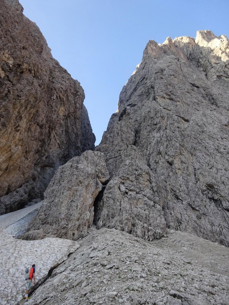 b.) Abstieg über die Nordost-Schlucht (Gola NE) des Wischberg: Diese Variante ist eine weiteres kleines Abenteuer, teils sehr ausgesetzt und erfordert absolute Trittsicherheit. Außterdem erst spät im Jahr machbar, da oft noch Schnee liegt. Vom Götterband quert man nach Westen (rechts) und quert dabei die Innominata (dt. Kleinspitz, Stahlseilversicherung bzw. Bohrhaken) bzw. den Gamsmutterturm (Torre delle Madri dei Camosci). So gelangt man in die Schlucht. Diese ist teilweise mit kurzen Klettersteigpassagen versichert. Gleich bei der Einmündung vom Götterband in die Schlucht beginnt (Blickrichtung Hütte) rechts ein Versicherter Abschnitt. Der Weg durch die NO-Schlucht verlangt Aufmerksamkeit und Konzentration - Absturzgefahr! Markierungen und Seilversicherungen sind ständigem Schneedruck ausgesetzt und können beschädigt sein. Nach schneereichen Wintern kann lange Schnee liegen- Steigeisen und Pickel mitnehmen! Abstiegszeit bis zur Hütte ca. 3-3,5 Stunden.