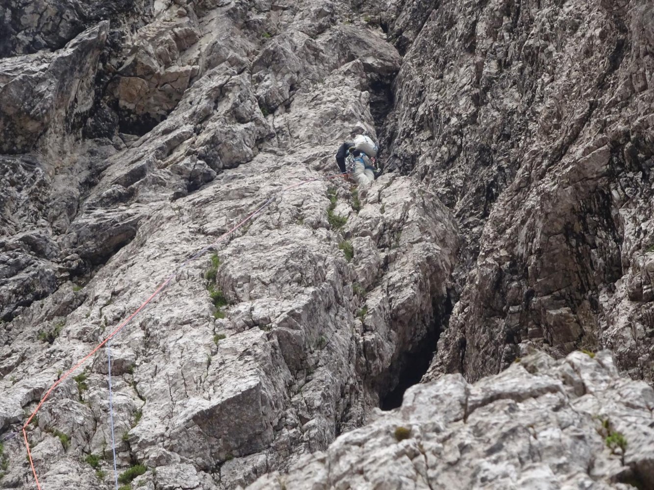 Vor einigen Jahren wurde die Tour von der österreichischen Bergrettung mit Bohrhaken saniert, jedoch wurden diese von den Italienern mit wenigen Ausnahmen wieder herausgeschlagen/abgeflext. Jedoch dienen sie oft als Orientierungshilfe bzw. kann man manche mit einem Klemmkeil als Zwischensicherung oder Standerweiterung verwenden. Haken und Hammer sollte man auf jeden Fall mitführen.