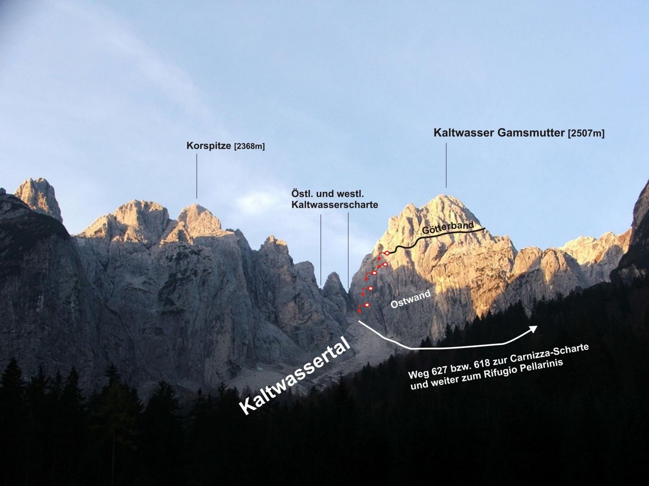 a.) Abstieg über das Kaltwassertal: Gängige Variante. Vom Götterband (Steinmänner) nach Osten (links), bis das ausgeprägte Götterband endet. Hier befindet man sich nun in der Ostwand des Berges und blickt ins Kaltwassertal. Rechts in der Wand befindet sich direkt neben dem Band der erste Abseilstand (2 Normalhaken mit Seil und Rapid-Gliedern). Nun seilt man 5 mal ab (siehe Topo) und gelangt so ins Kaltwassertal. Abseilen mittels Doppelseil jeweils zwischen 50 und 55 Meter. Die Stände sind mit roten Punkten markiert!