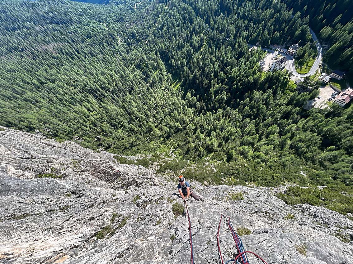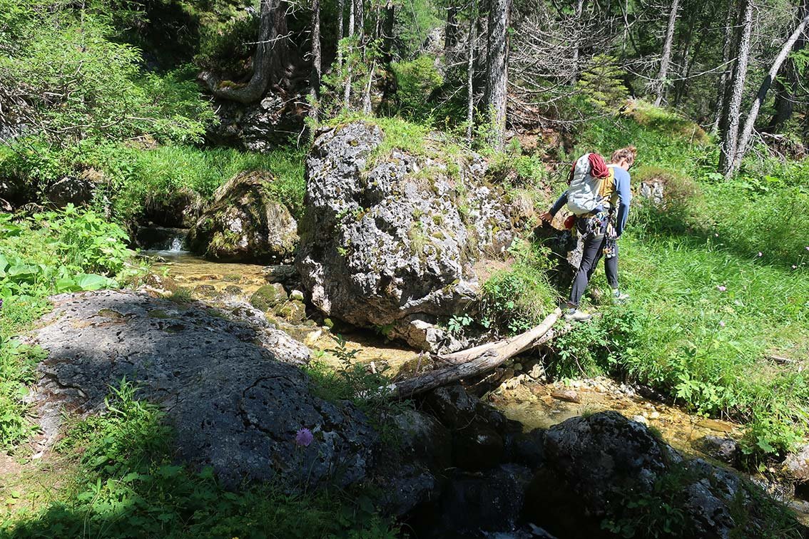 Hinter den Häusern von Pian di Falzarego auf einem Pfad zum Bach und diesen überqueren. Man folgt dem Pfad Fußabwärts bis dieser nach links ansteigt. Im Latschengelände auf einem Pfad nach links und unterhalb des Einstieges in einer Rinne links der Latschen auf kleine Wiesenabsatz beim Abstieg.