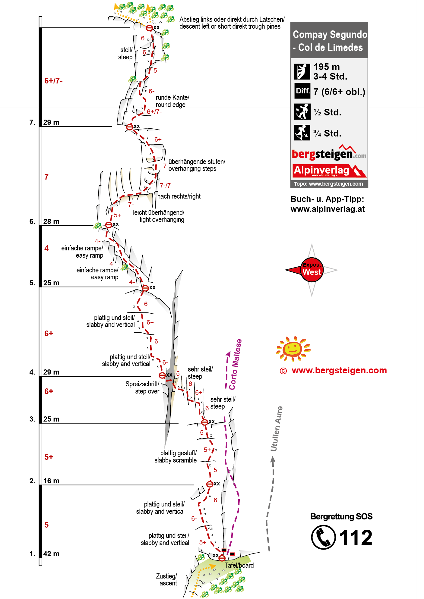 Unten verläuft sehr knapp rechts die Corto Maltese (7-), man hält sich links davon.