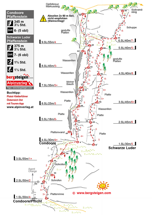 Tolle Tour im rechten Bereich der Pfaffenstein Südwand. Nach drei rustikal-schrofigen Zustiegslängen, kommen fünf großartige Seillängen auf Wasserrillen-Platten. Die letzte Seillänge ist wieder etwas grasig. Insgesamt aber schön!!