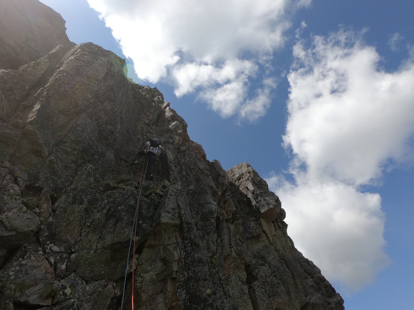 - 1. SL: Die erste Seillaenge startet in einen geoeffneten Kamin der anfaenglich noch sehr kompakt ist und rechts des Kamins gute Risse zur absicherung bietet. Nach ca. 12m steilt sich der Kamin auf und der Fels wird zu losen Schuppen. Bei diesen Quert man nach links, klettert dort eine kleine Platte nach oben und quert dann direkt wieder nach rechts unter einen kleinen Ueberhang durch. Danach wieder gerade rauf ueber eine begraste Flaeche und danach kommt ein Felsblock und darueber ist ein Riss der sich fuer den Standplatzbau perfekt eignet.